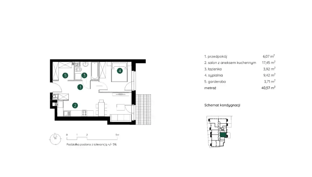 - Charakterystyka mieszkania 40.57 m2, 2 pokoje
