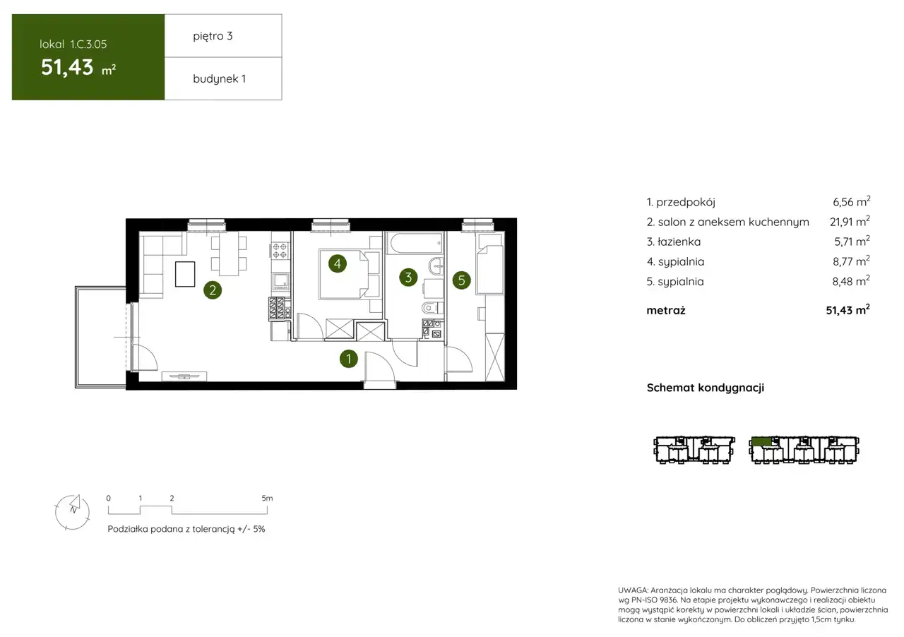 - Charakterystyka mieszkania 51.43 m2, 3 pokoje