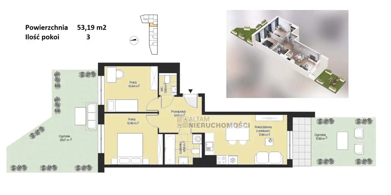 - 2 x ogródek: pow. 26,17 m2 oraz 17,49 m2