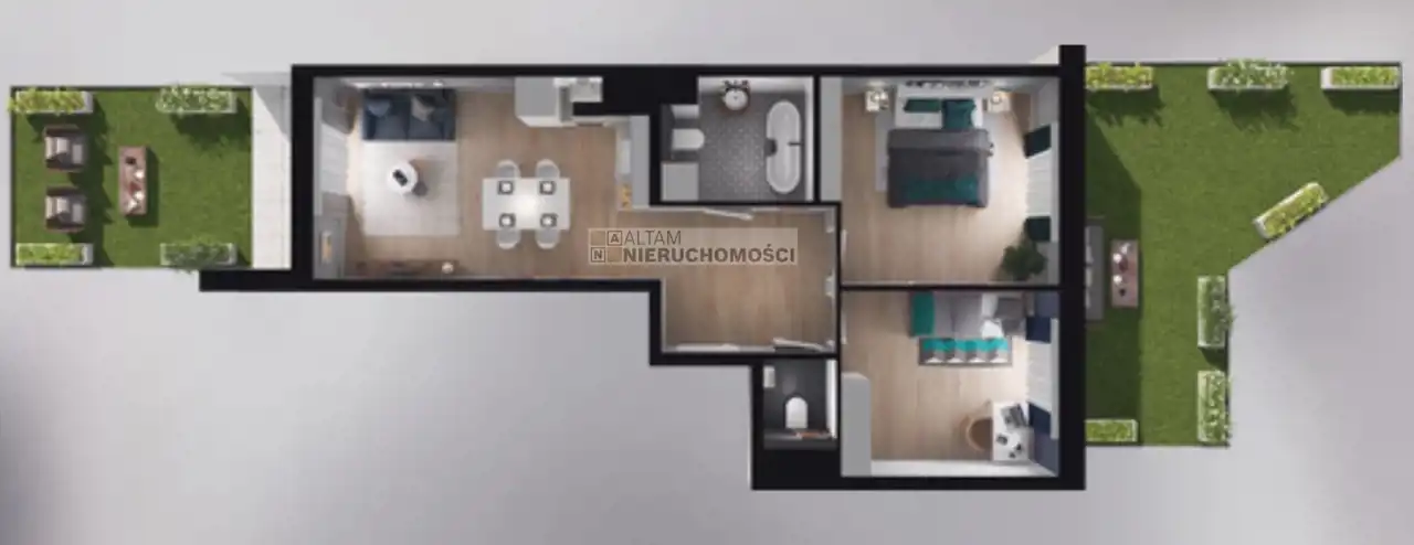 - pokój dzienny z aneksem kuchennym + 2 pokoje