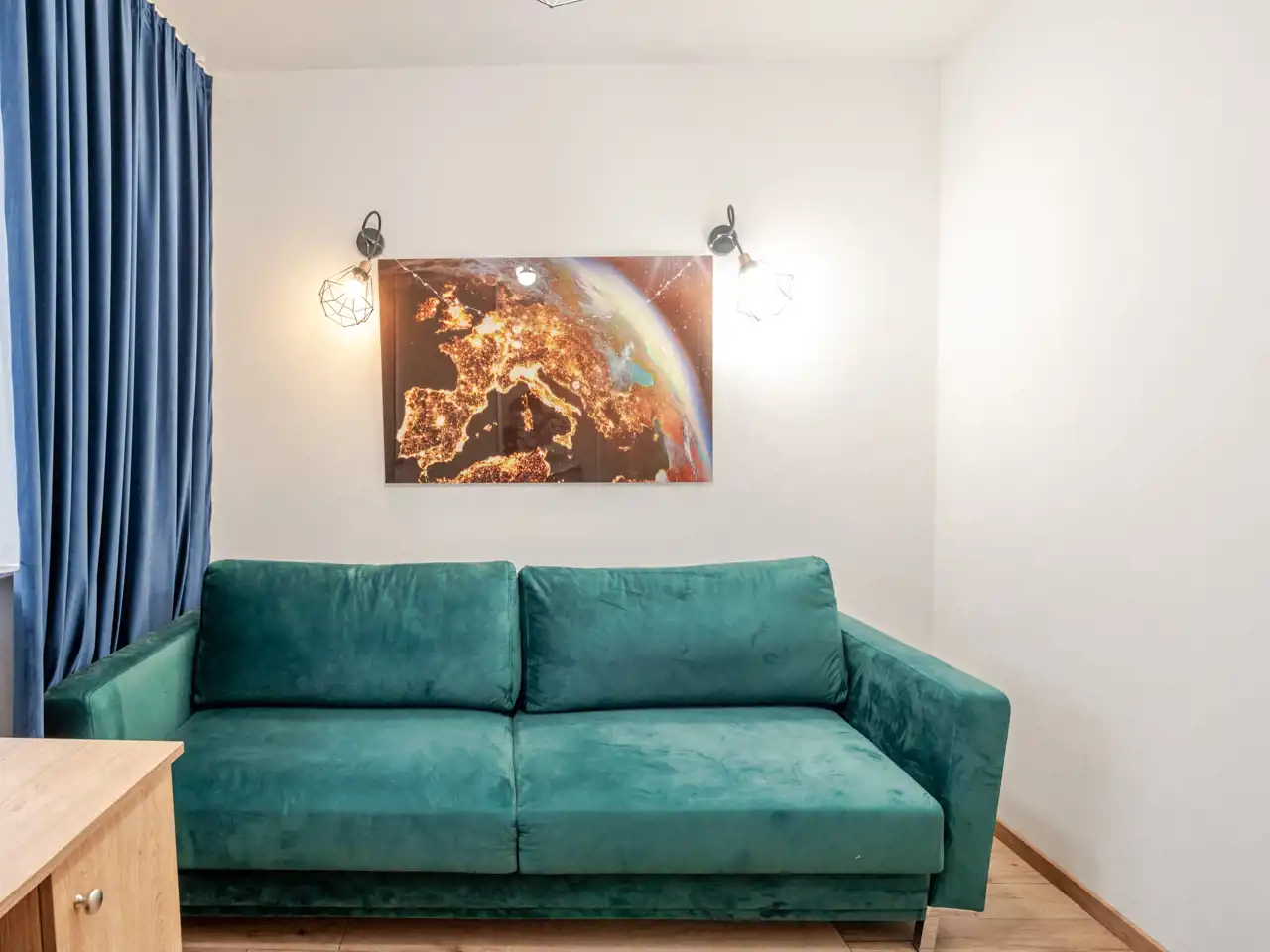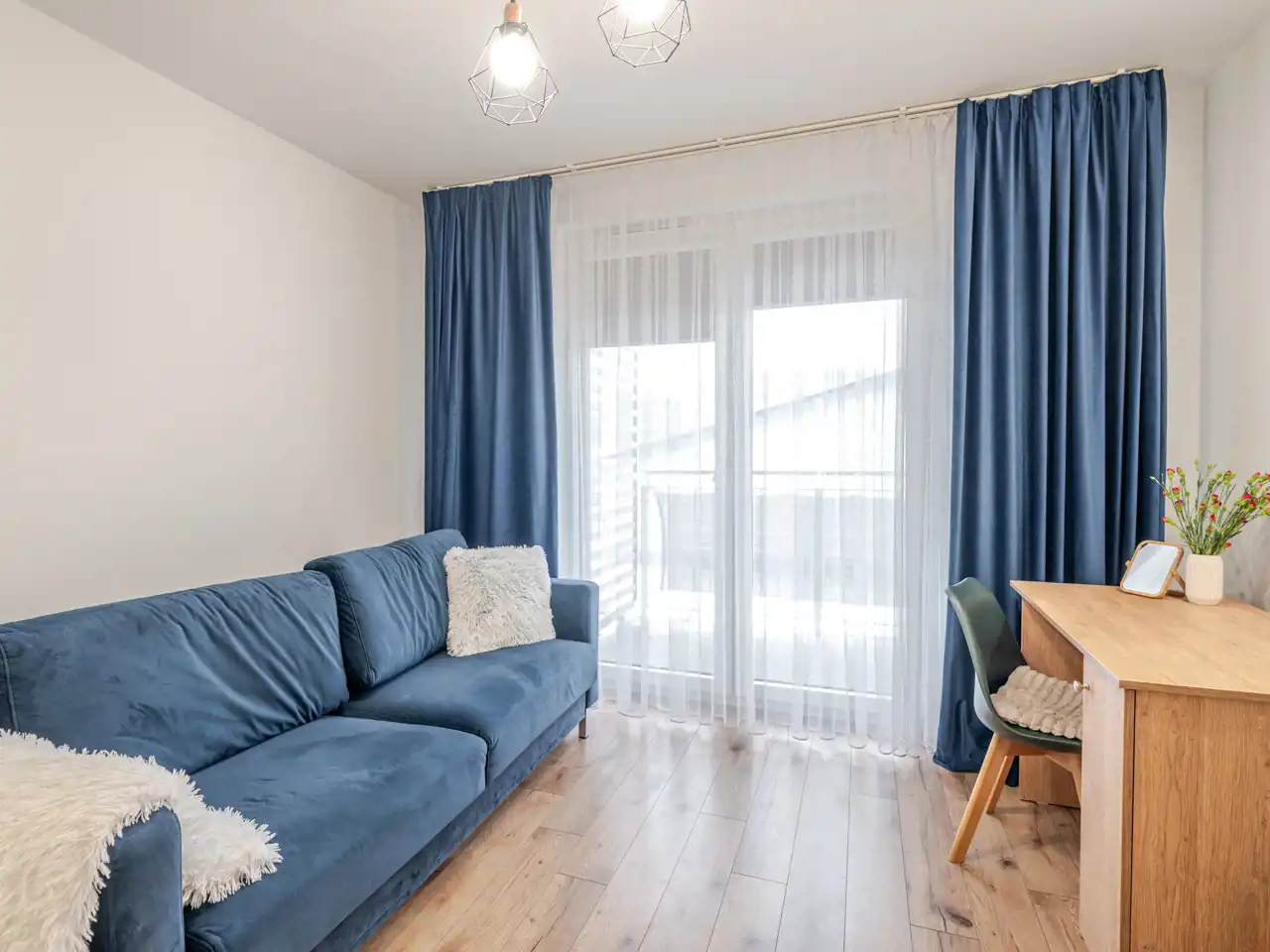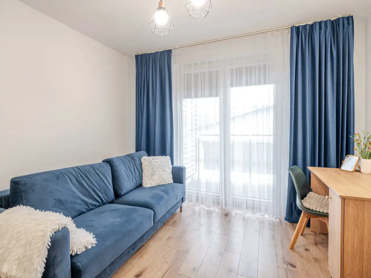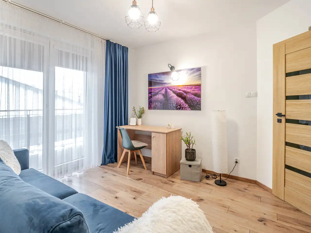 Na powierzchnie mieszkania składają się dwa niezależne pokoje o pow. 14,5 i 10,5 m2 - oba pokoje z rozkładaną sofą, bardzo pojemną szafą oraz miejscem do pracy. Dzięki przemyślanemu projektowi oba pokoje są w pełni funkcjonalne i zapewniają prywatność.