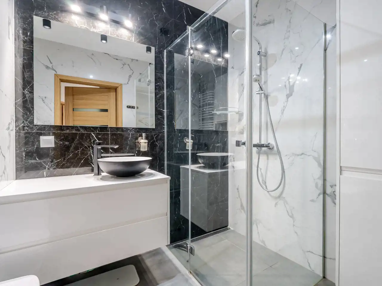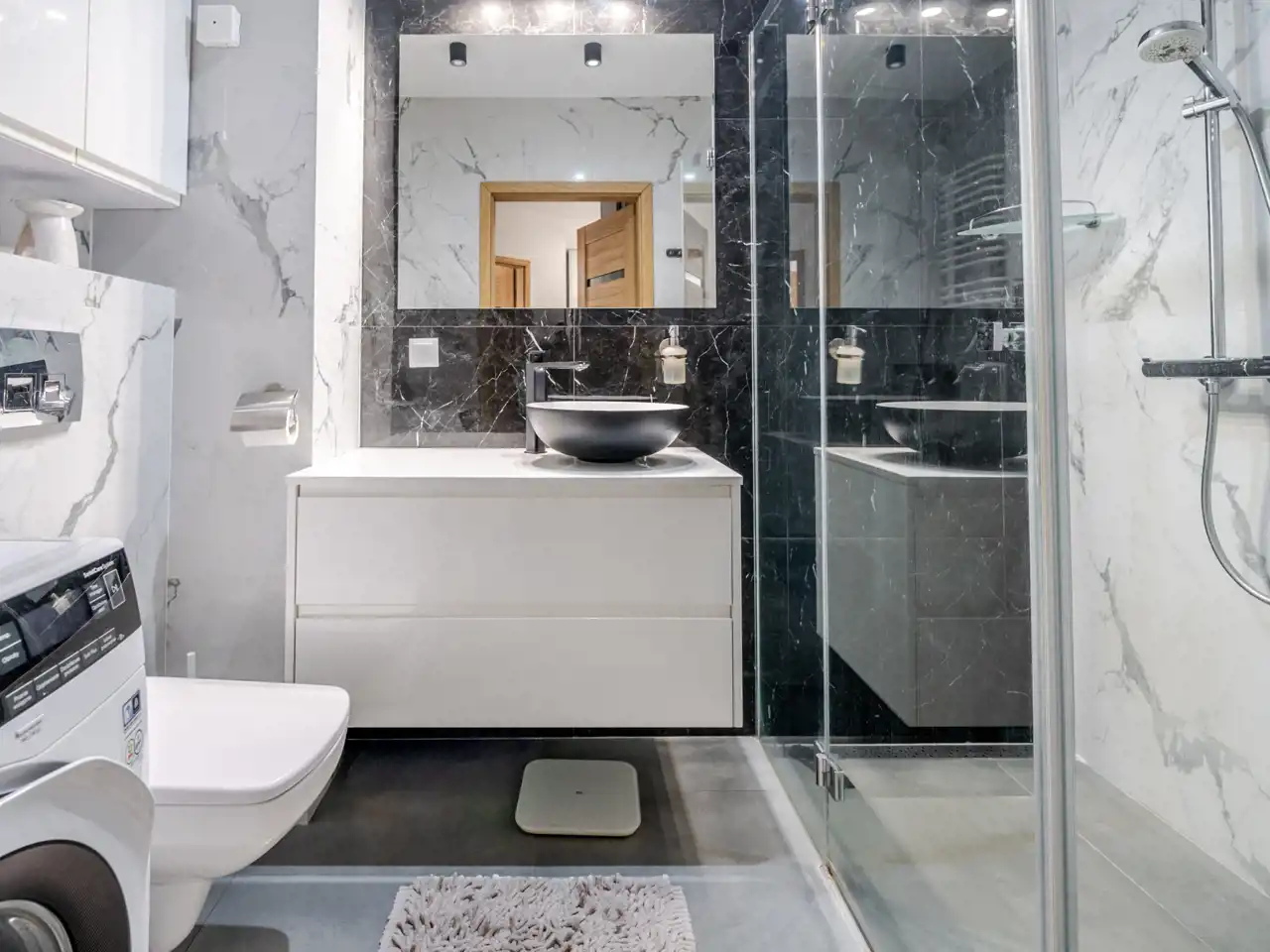 Elegancka łazienka w bieli i czerni. Kontrastowe połączenie czarnych akcentów z białymi powierzchniami tworzy nowoczesny, luksusowy charakter. Dobrej jakości armatura, duże lustro, zabudowa meblowa oraz wygodna kabina prysznicowa nadają wnętrzu hotelowy standard.