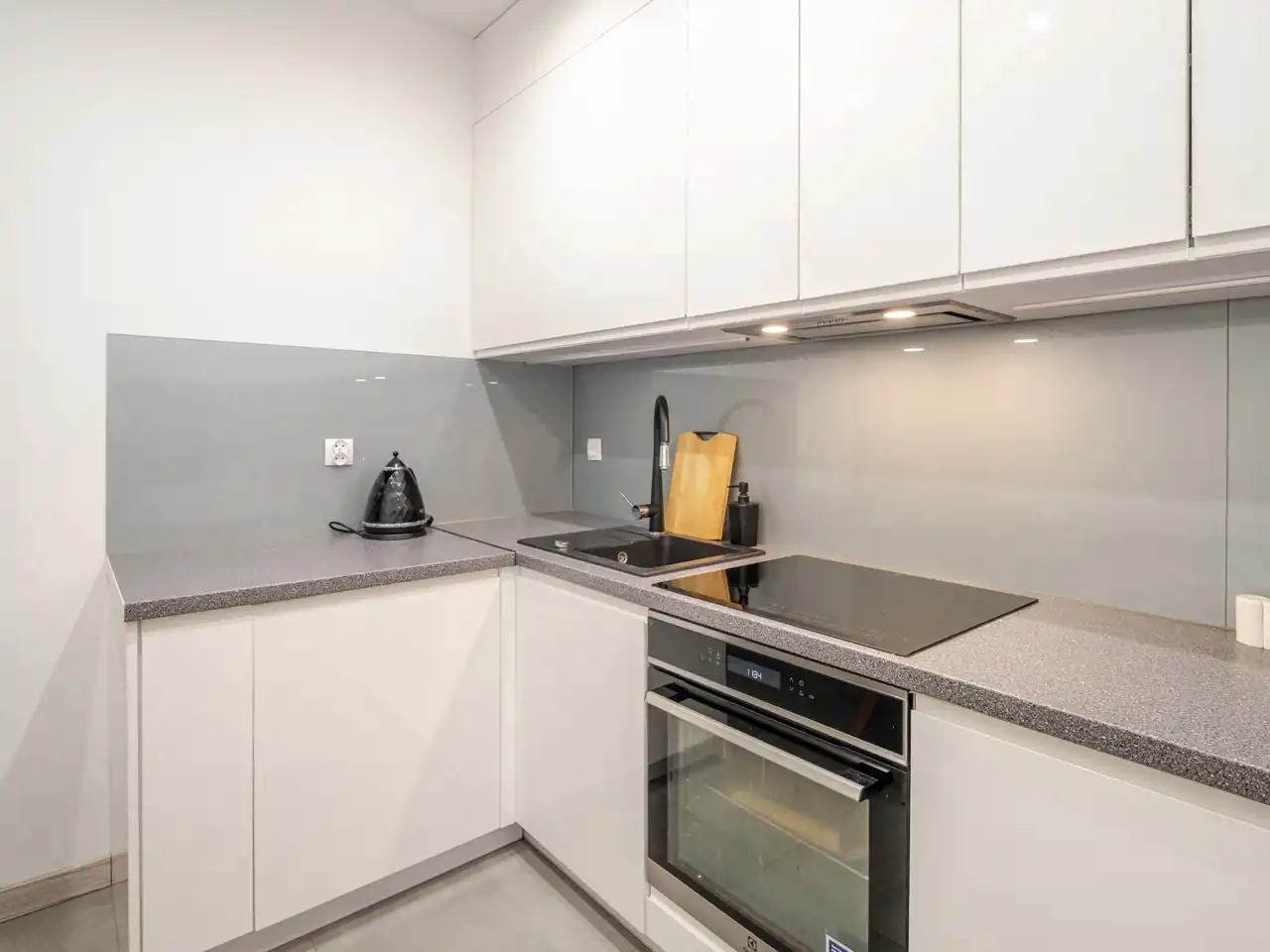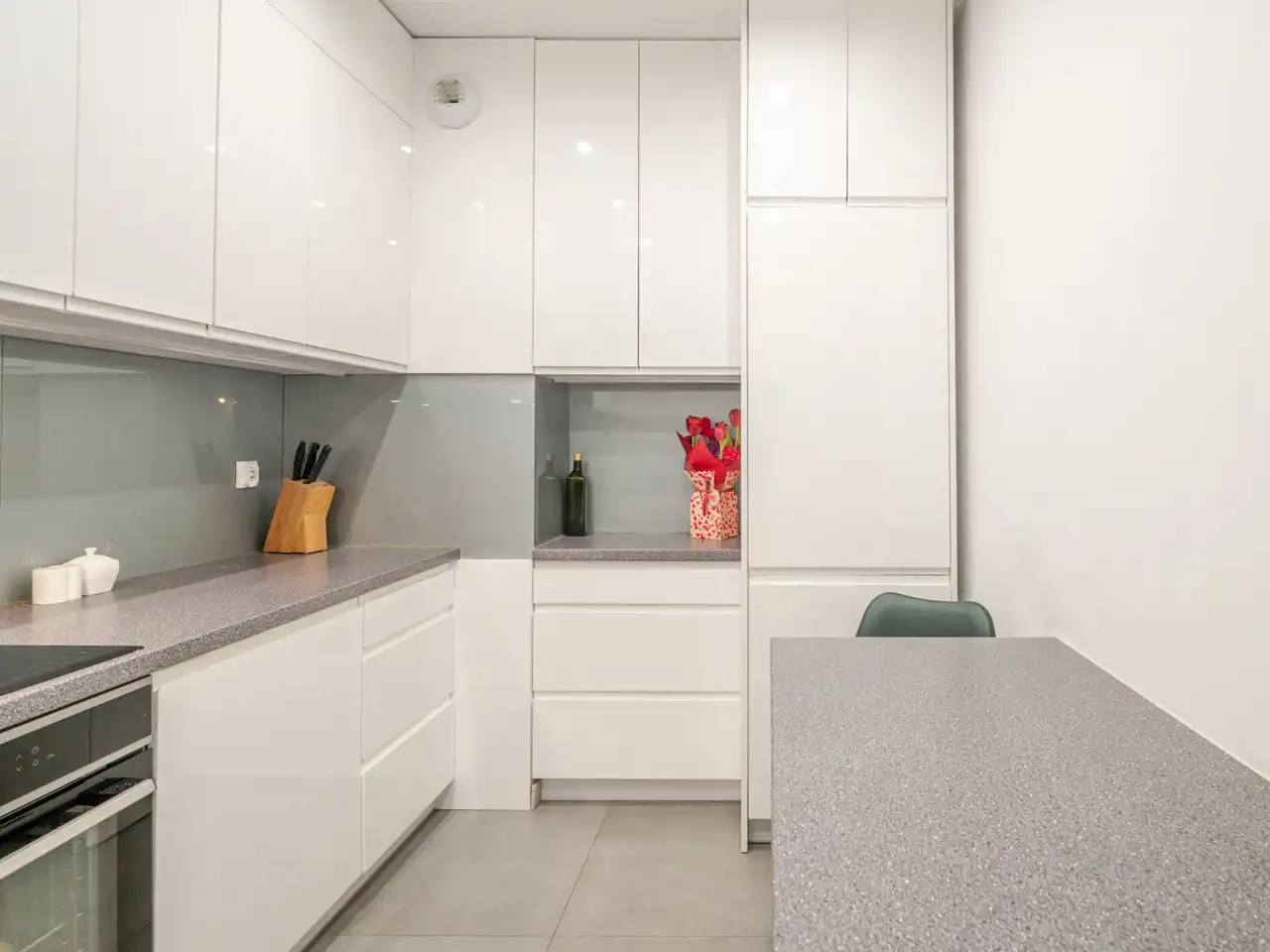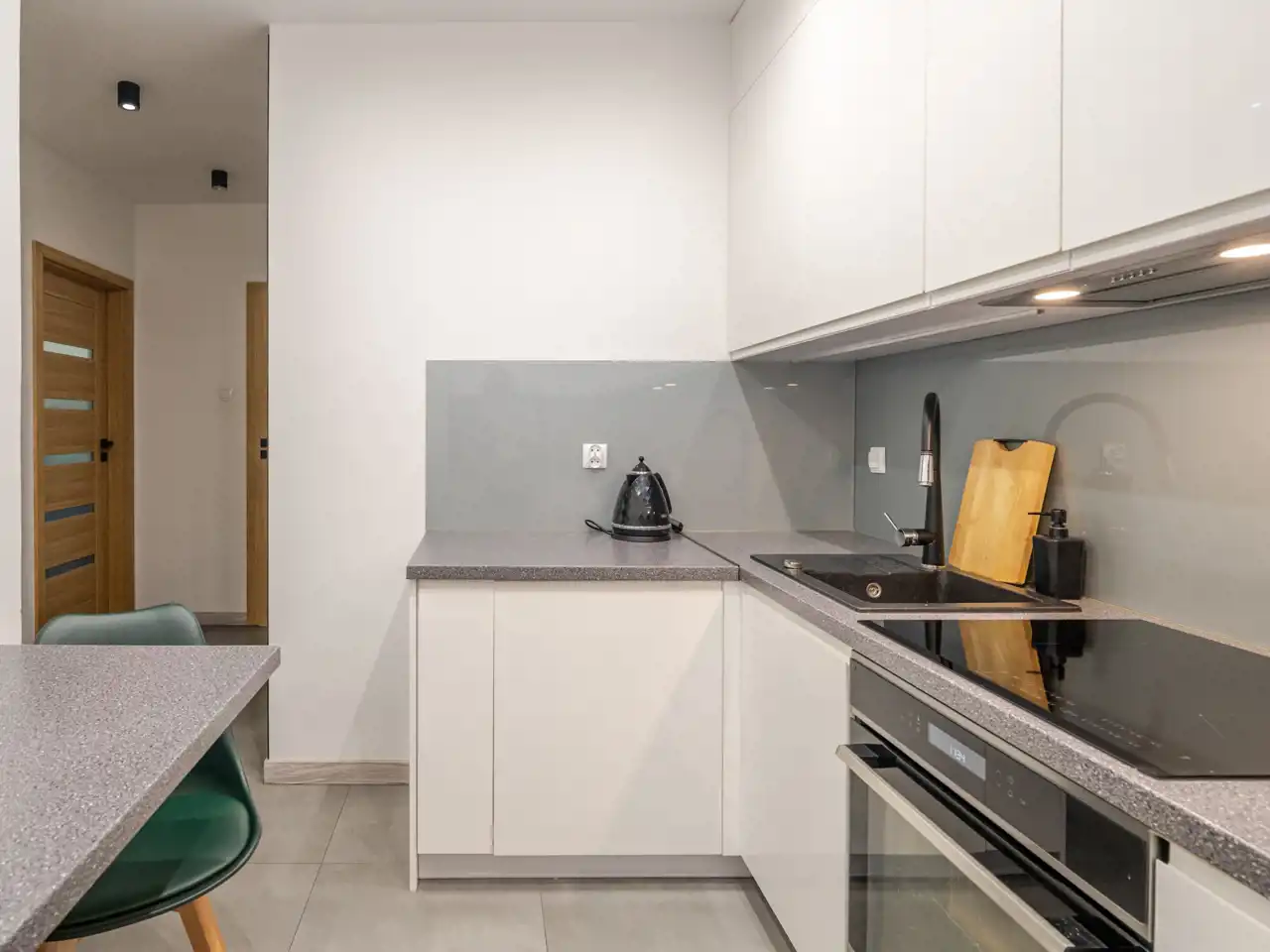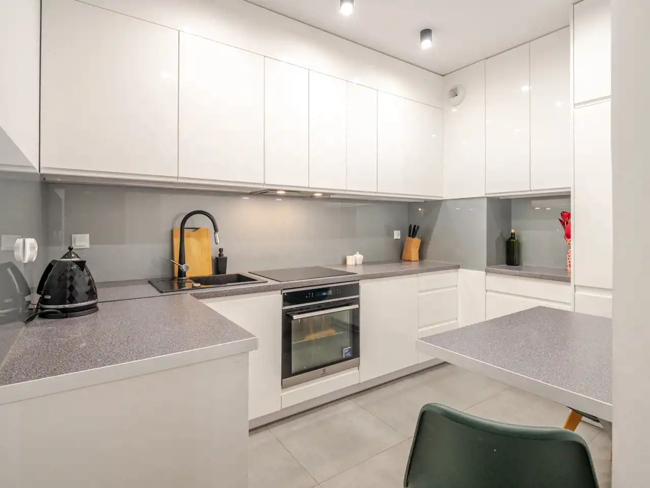 Nowoczesna, w pełni wyposażona, z zabudową wykonaną na wymiar. Przestrzeń została zaprojektowana tak, aby wygodnie korzystały z niej dwie osoby mieszkające niezależnie. Dobrej klasy sprzęty AGD i dużo miejsca do przechowywania.