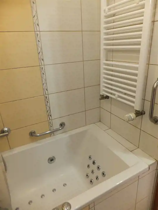 • Łazienka z wanną do hydromasażu z prysznicem, umywalką i pralką.