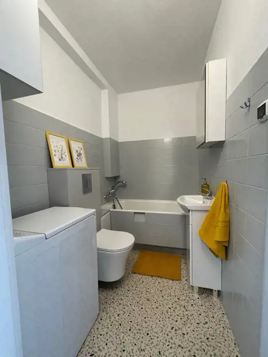 w łazience szafki na wymiar, wanna, wc, na podłodze nowa wykładzina PCV