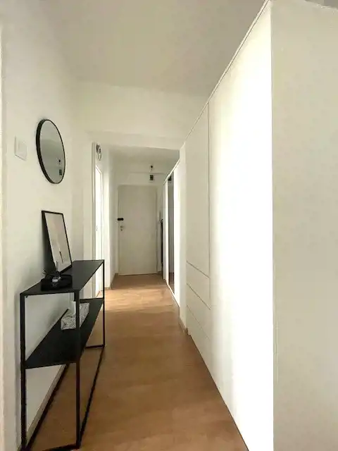 w przedpokoju panele podłogowe i pakowne szafy wnękowe.