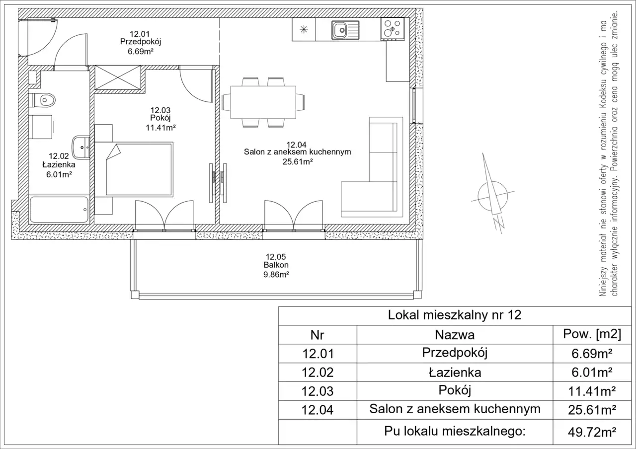 - Charakterystyka mieszkania 49.6 m2, 2 pokoje