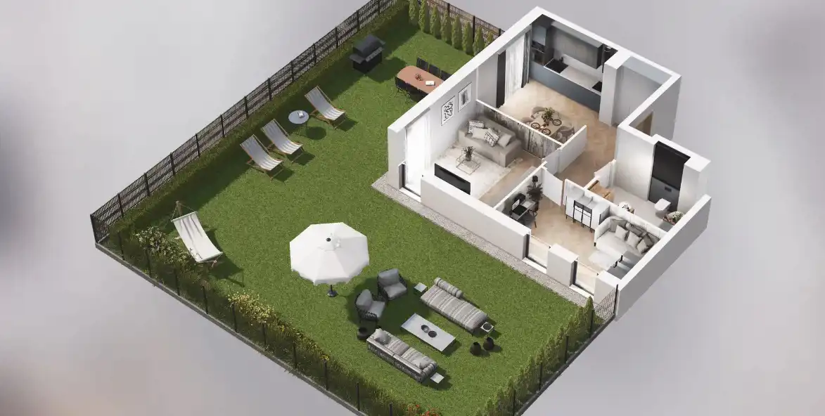 Mieszkanie składające się z kuchni, dwóch sypialni, przedpokoju, łazienki oraz ogródka o pow. 160m2