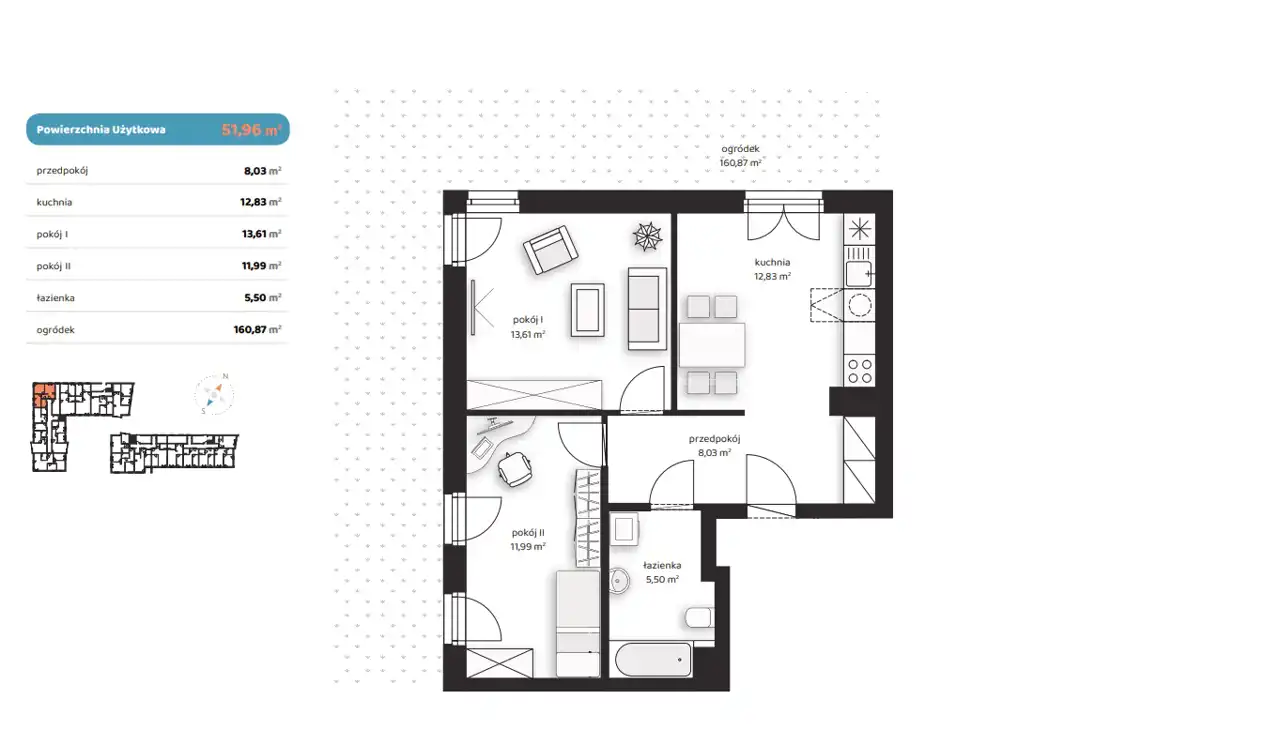 - Charakterystyka mieszkania 51.96 m2, 2 pokoje