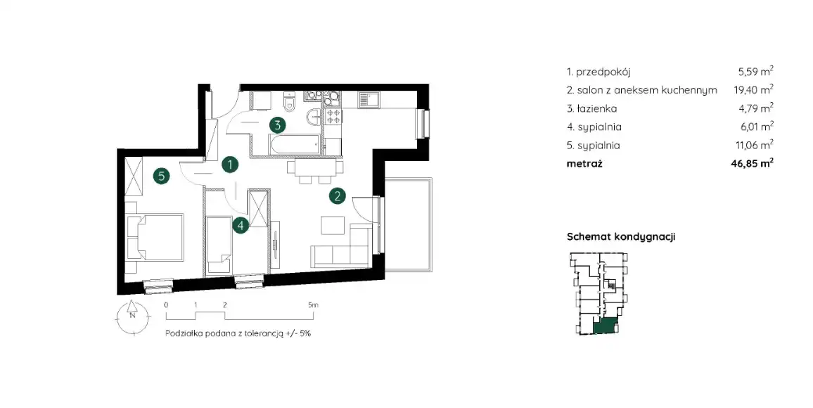 - Charakterystyka mieszkania 46.85 m2, 3 pokoje