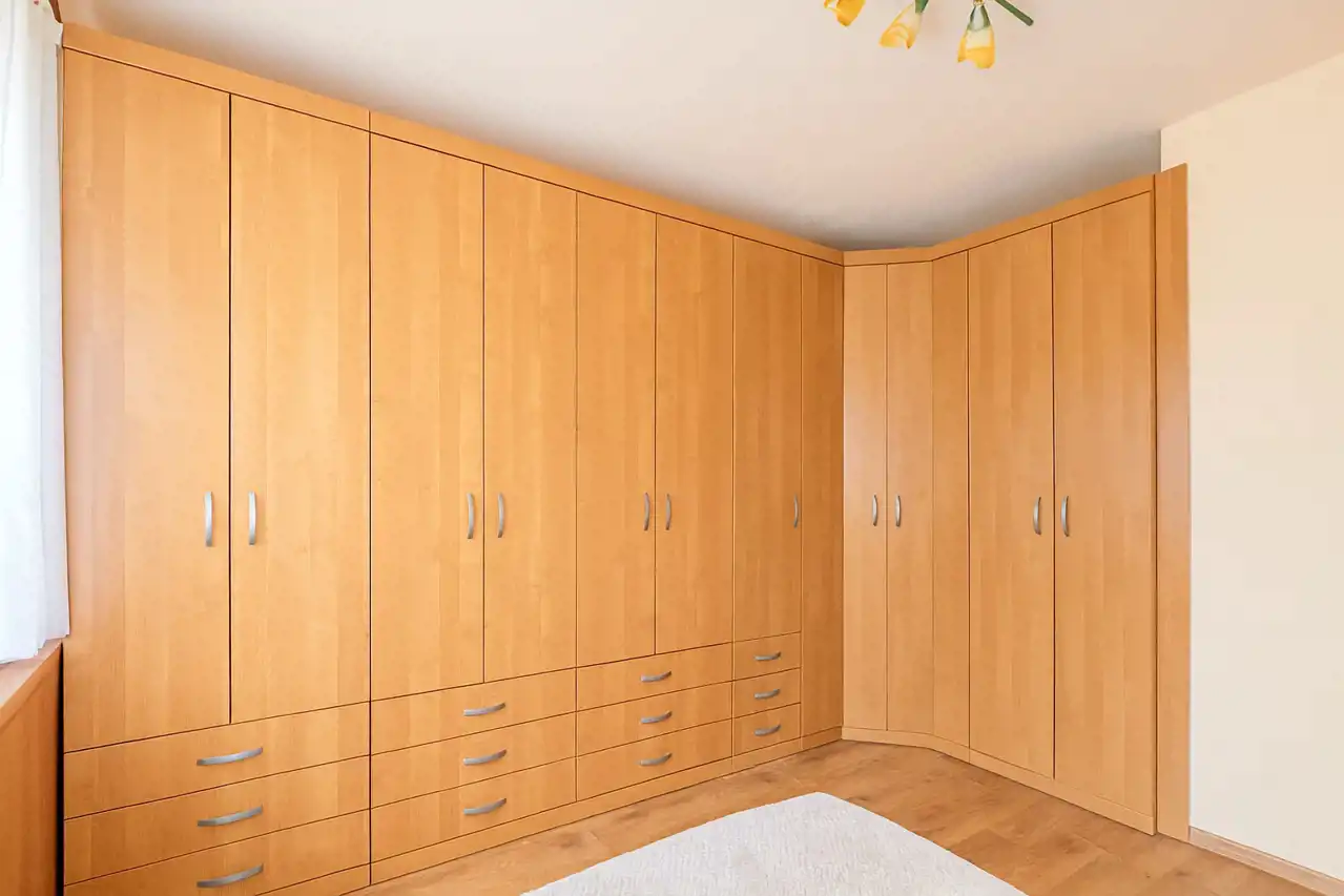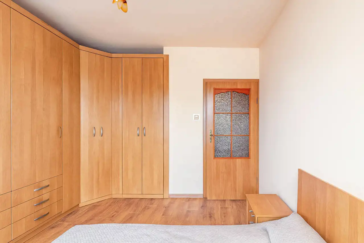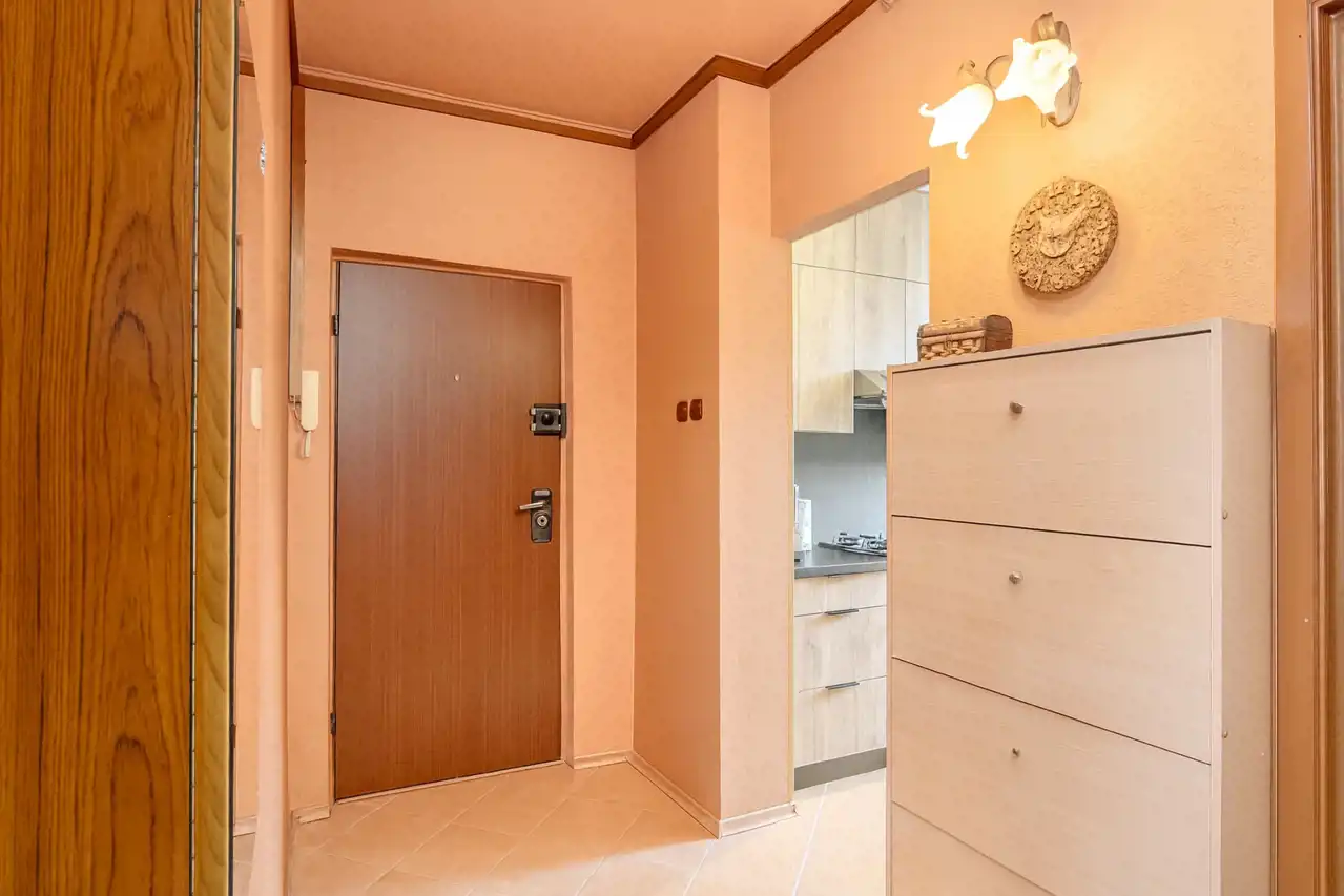 • Przestronny przedpokój z dużą szafą, szafką na buty i dodatkowymi zamkniętymi półkami