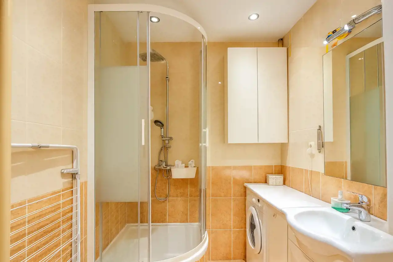• Łazienka z kabiną prysznicową, pralką i szafkami