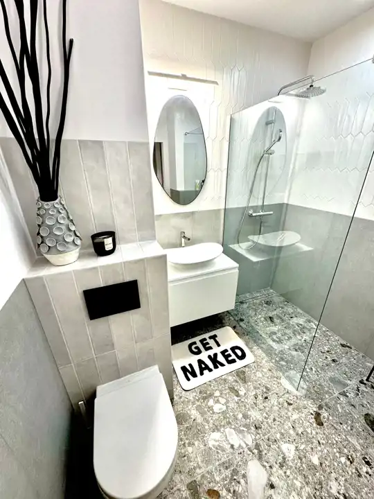 Łazienka z kolei wyposażona jest w nowoczesne sanitariaty firmy Villeroy Boch oraz Hansgrohe, a kuchnia w sprzęt AGD, takie jak lodówka, piekarnik i płyta marki Bosch.