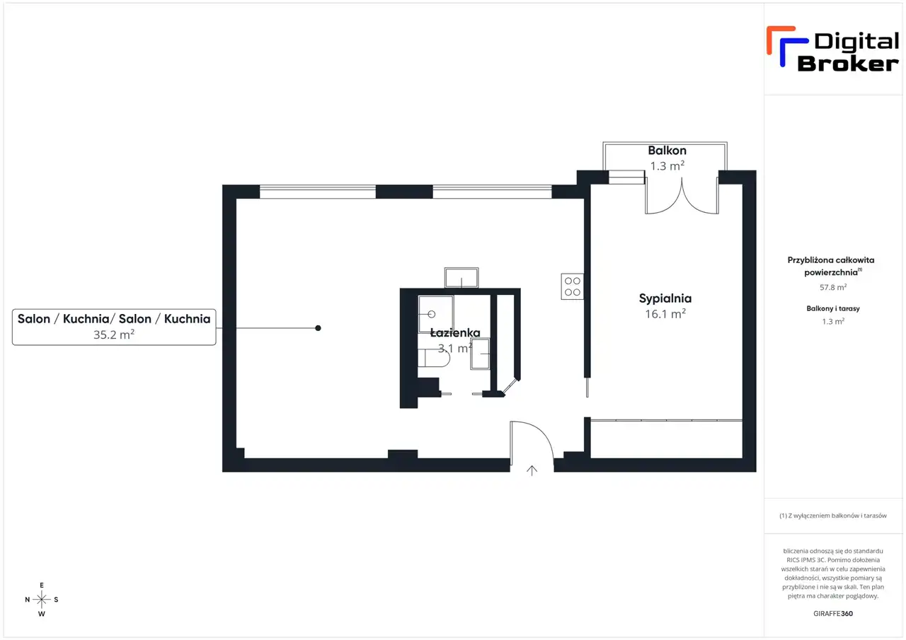 Na 57 m² znajdują się:- Pokój dzienny z otwartą kuchnią
