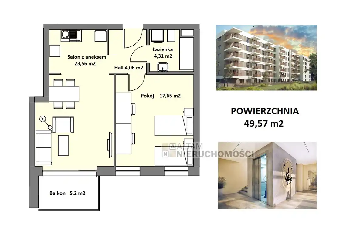 - Charakterystyka mieszkania 49.57 m2, 2 pokoje