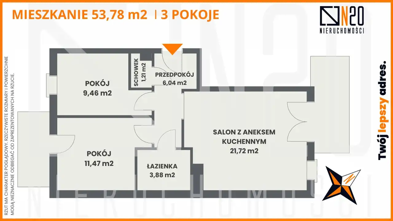 - Charakterystyka mieszkania 53.78 m2, 3 pokoje