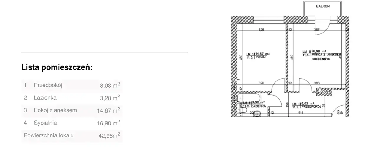 - Charakterystyka mieszkania 42.96 m2, 2 pokoje