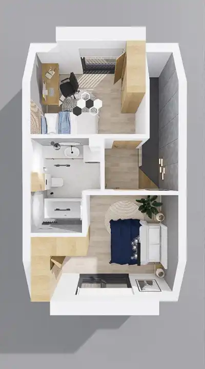 sypialnia (12,14m2), pokój (9,65m2), komunikacja (2,16m2), łazienka (5,46m2).