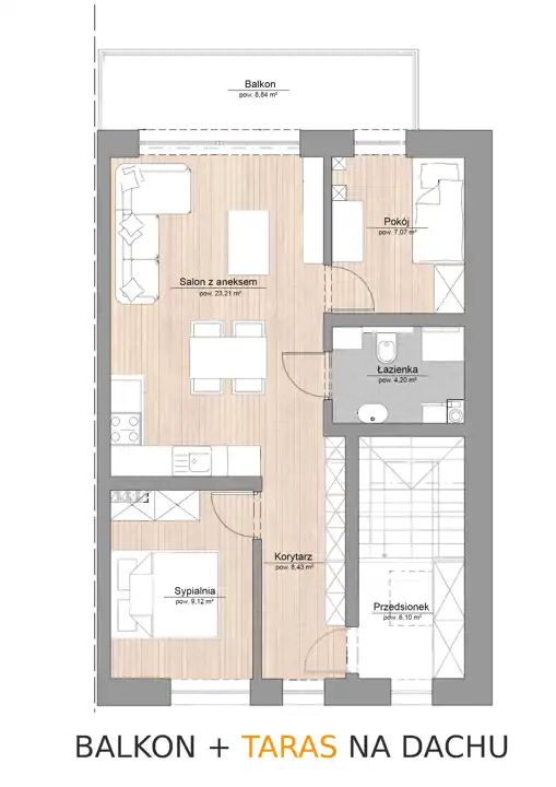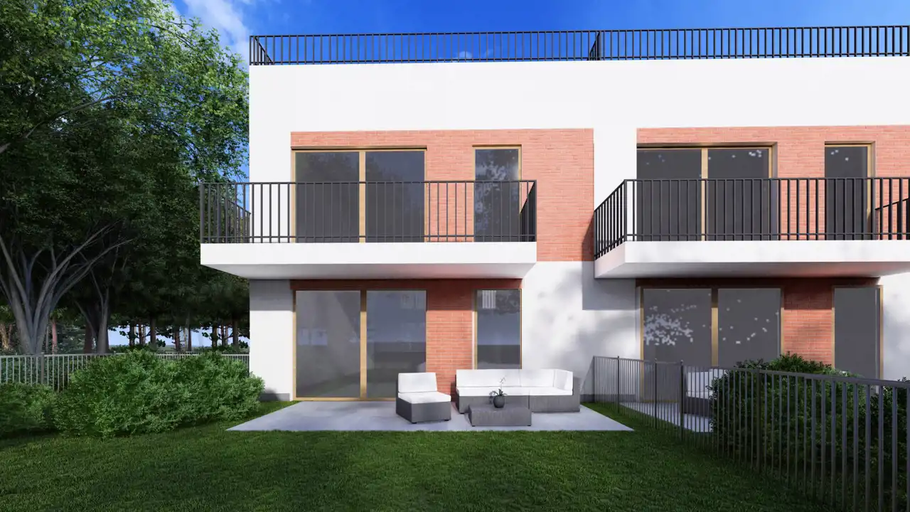 model B: położenie na pierwszym piętrze o powierzchni 63 m2 z własną klatką schodową, mieszkanie jest z dużym balkonem o powierzchni ok 9m2, oraz tarasem na dachu (nad mieszkaniem). 2 apartamenty z 1 piętra będę posiadały w cenie również ogródki.