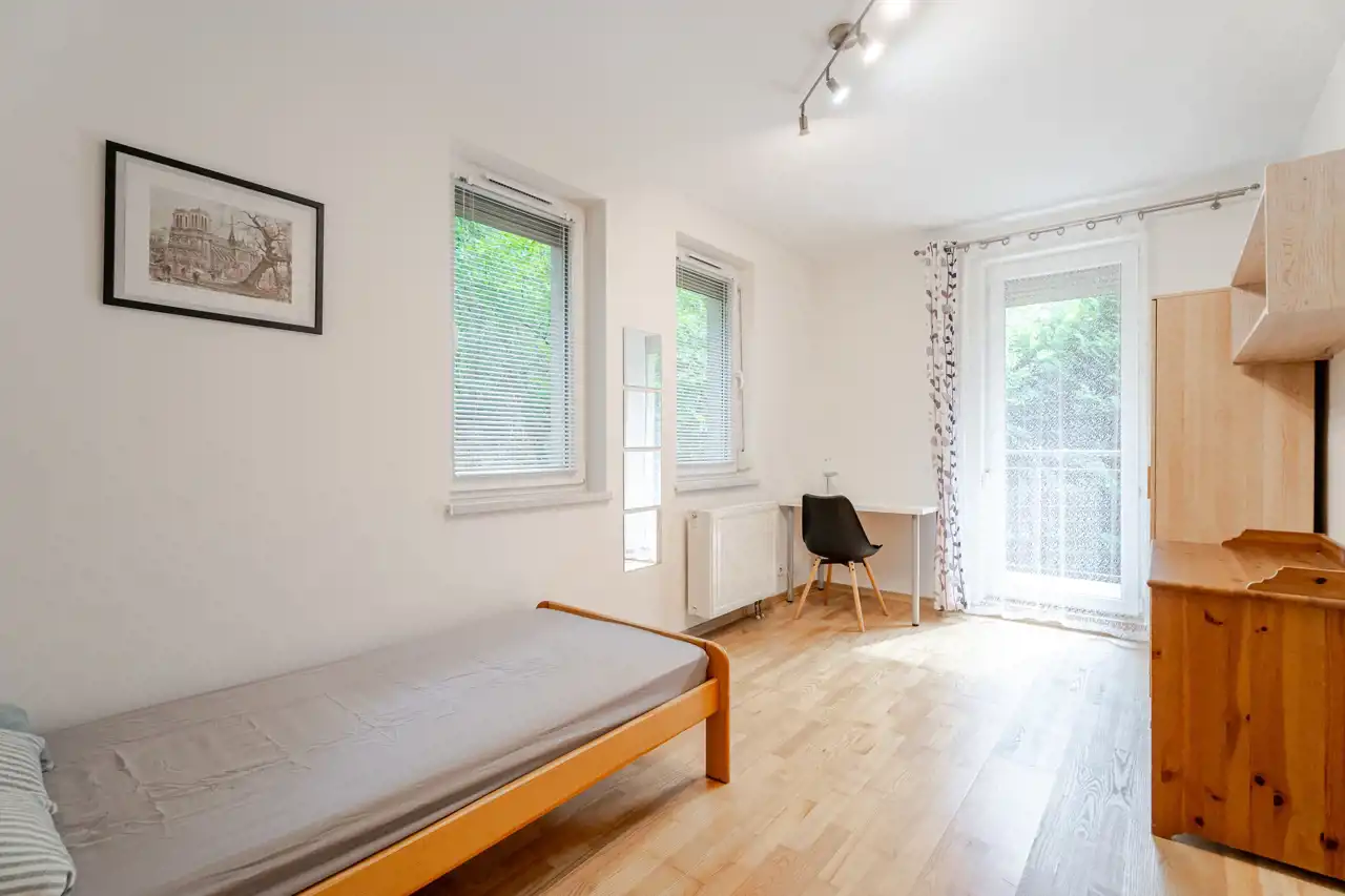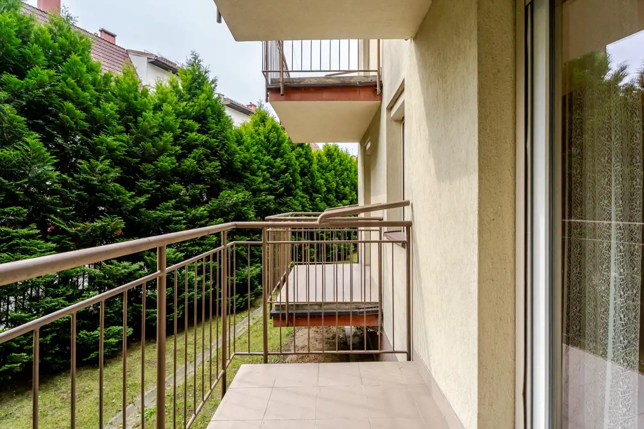 - trzech oddzielnych pokoi o powierzchniach 16 / 14 / 8 m2 , ekspozycja wschód, płd i płd/zachód, na podłogach deska barlinecka, dwa pokoje posiadają balkony, trzeci - rozległy balkon jest wspólny dla pokoju i kuchni. Balkony wychodzą na rozległe tereny pełne zieleni.
