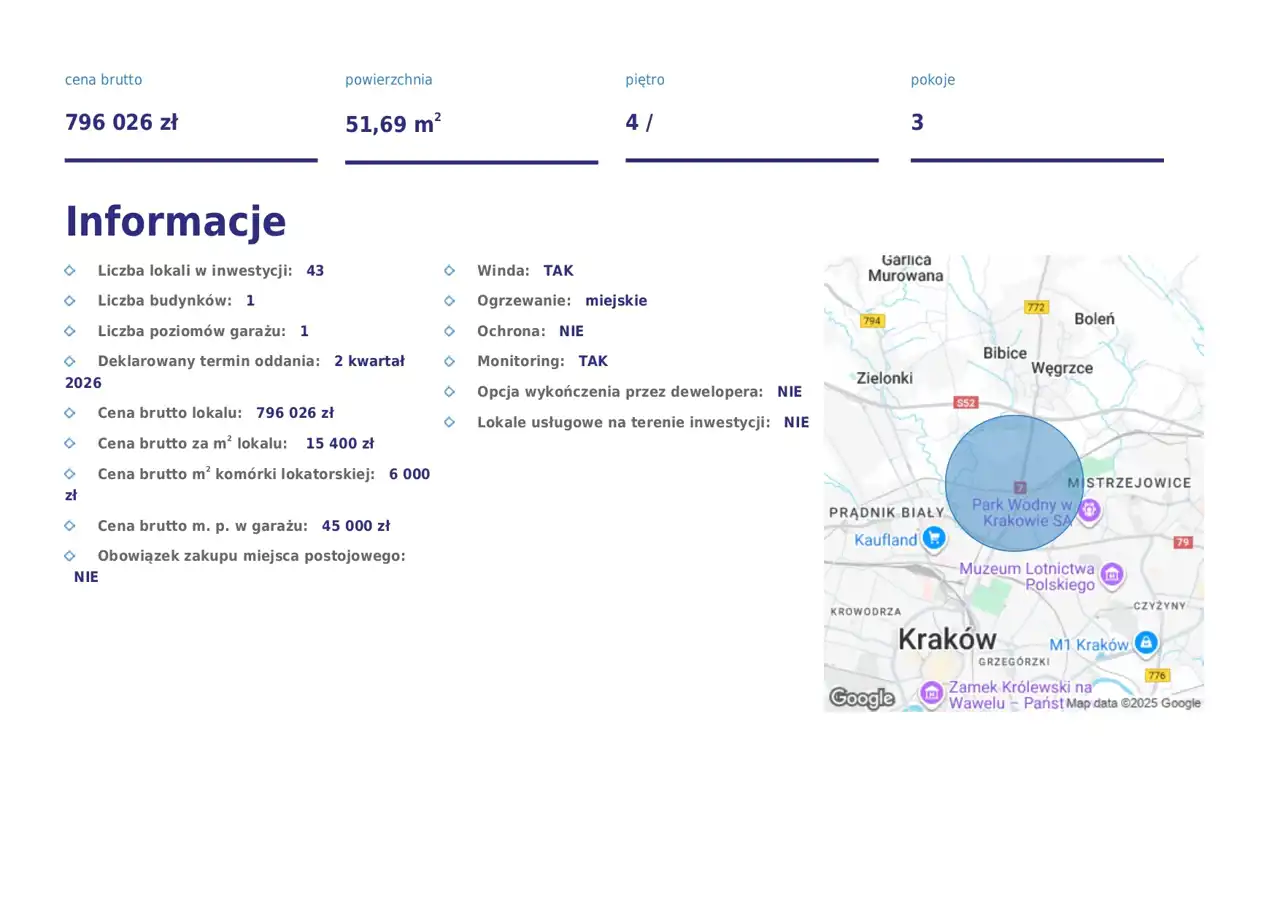 Cena: 796 026 zł | Metraż: 51,69 m² | Pokoje: 3 | Piętro: 4 | Odbiór: II kw. 2026 | Winda: TAK | Cena/m²: 15 400 zł/m².
