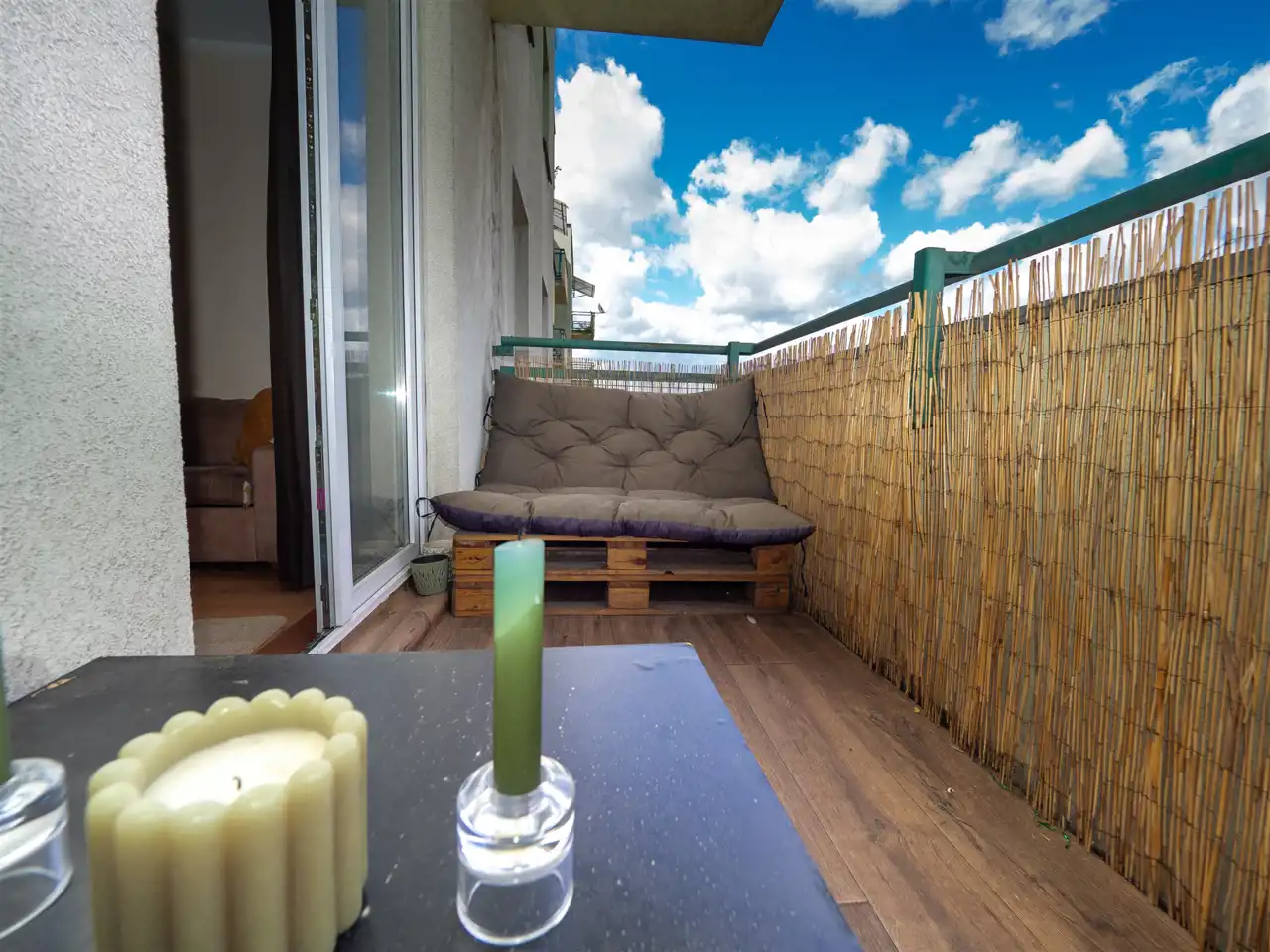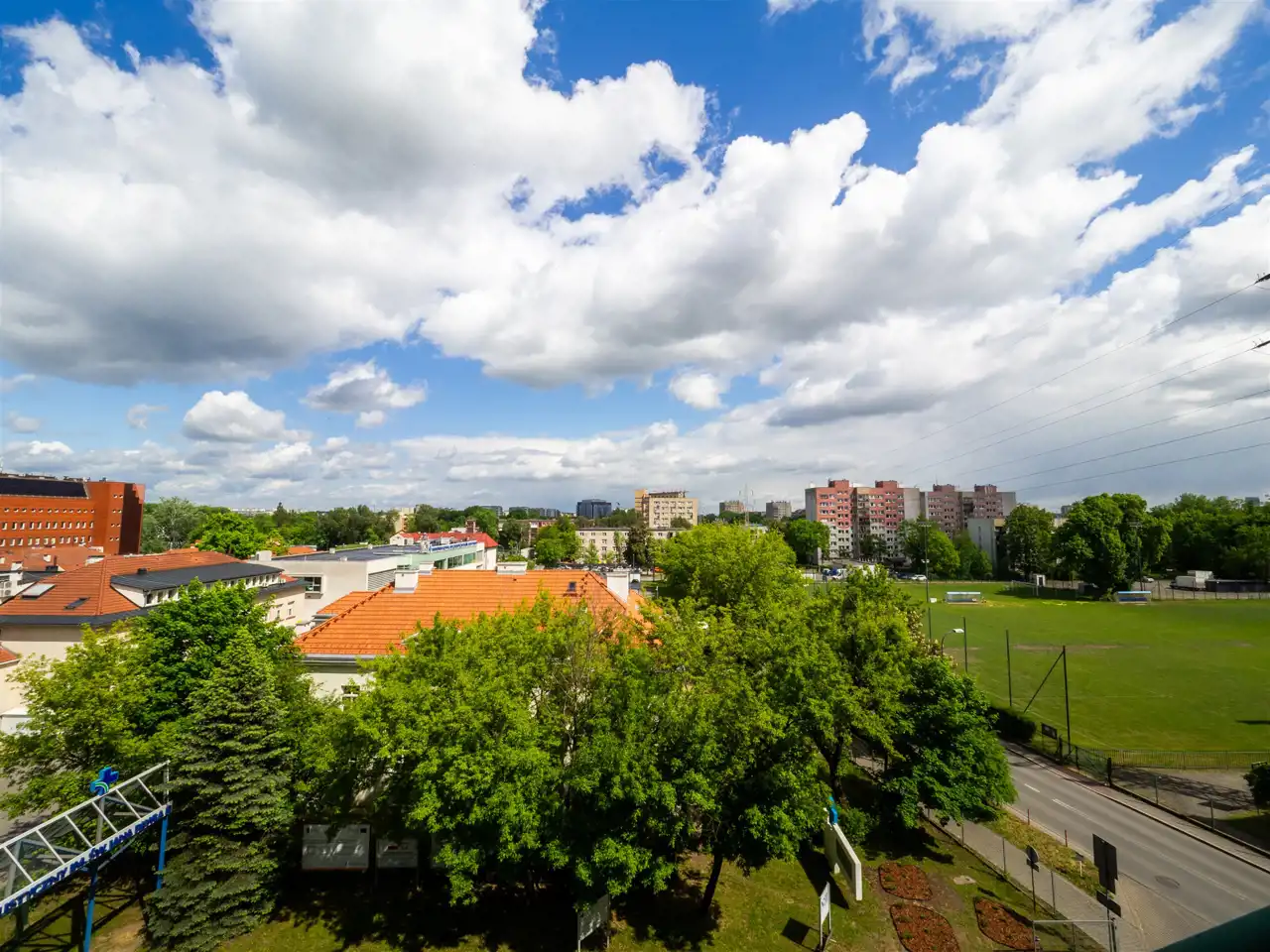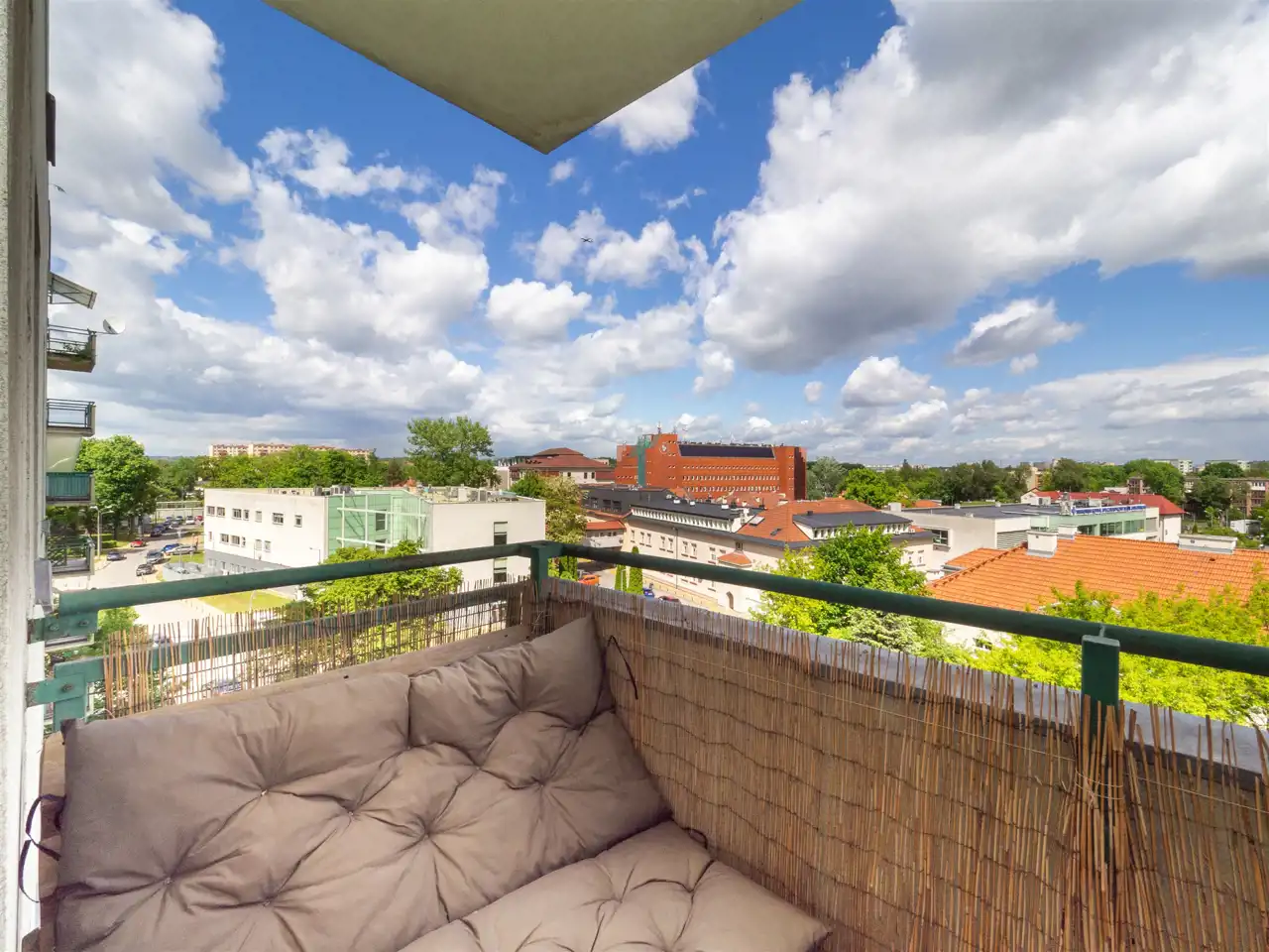 Balkon z ekspozycją północną oferuje pełną prywatność – bez wysokich zabudowań za oknem i z widokiem na panoramę miasta.