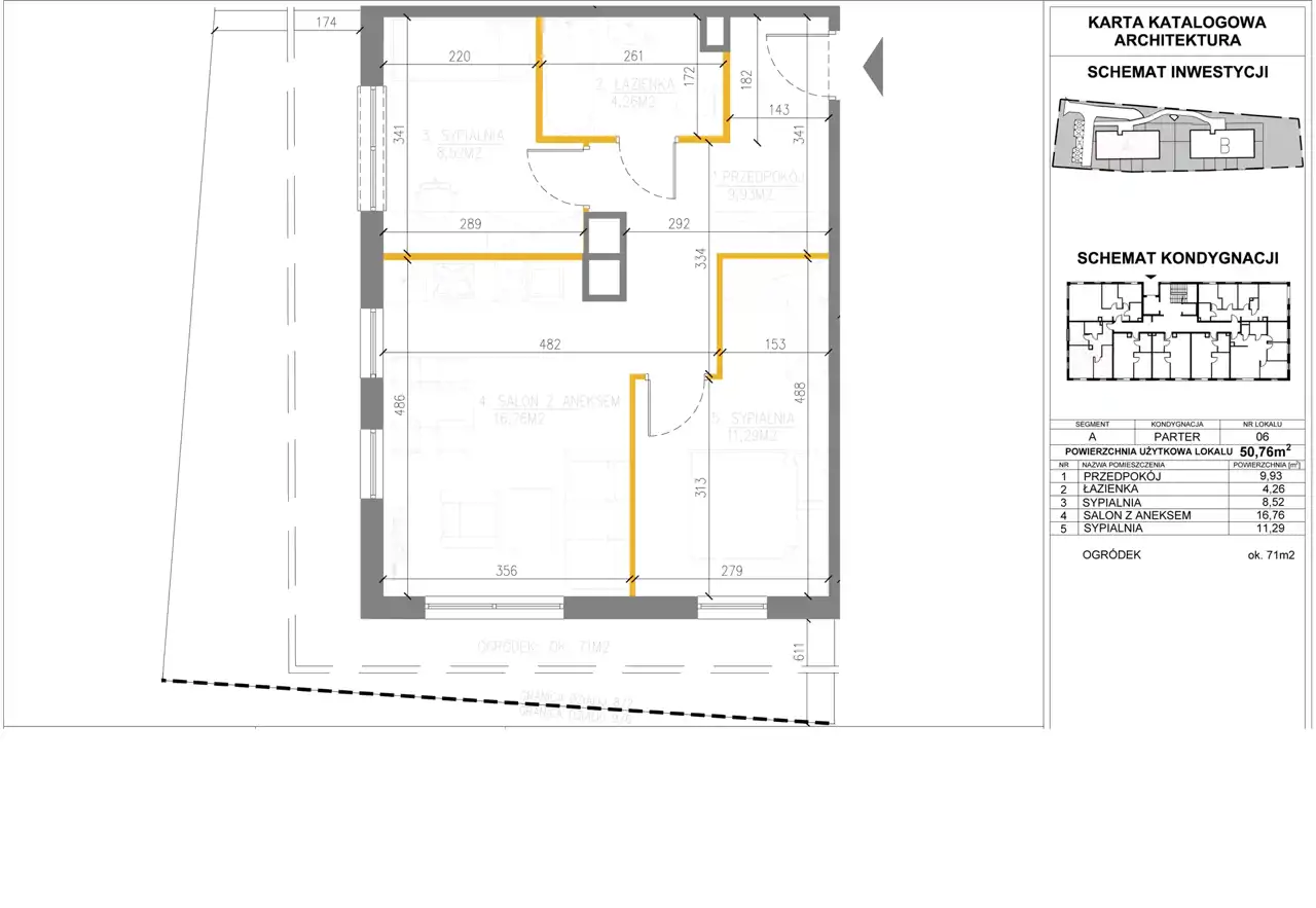 Rozkład pomieszczeń: przedpokój (9,93m2), WC (1,52m2), łazienka (4,26m2), sypialnia (8,52m2), sypialnia (8,24m2), sypialnia (11,29m2), salon z aneksem (16,76m2). Do mieszkania przynależy ogródek o pow. około 71m2