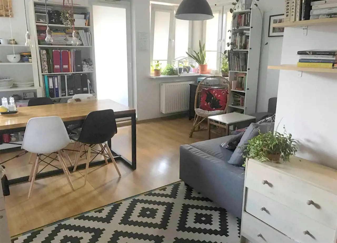 Jest jasne, przestronne, ustawne i daje możliwość dowolnej aranżacji przestrzeni oraz urządzenia według własnych upodobań. Ściana pomiędzy kuchnią a pokojem została wyburzona tworząc otwartą przestrzeń dzienną, ale istnieje możliwość przywrócenia poprzedniego układu.