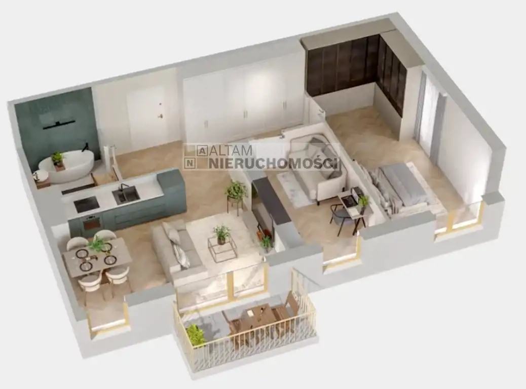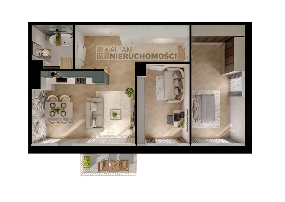 - salon z aneksem kuchennym + 2 pokoje