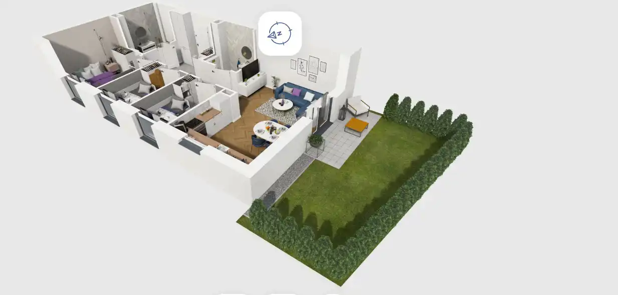Mieszkanie składające się z salonu z aneksem kuchennym, trzech sypialni, przedpokoju, łazienki, WC oraz ogródka o pow. 23m2