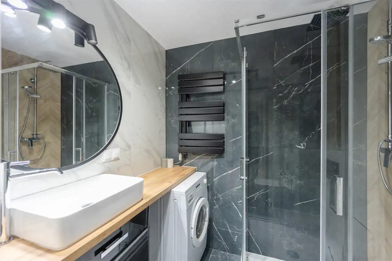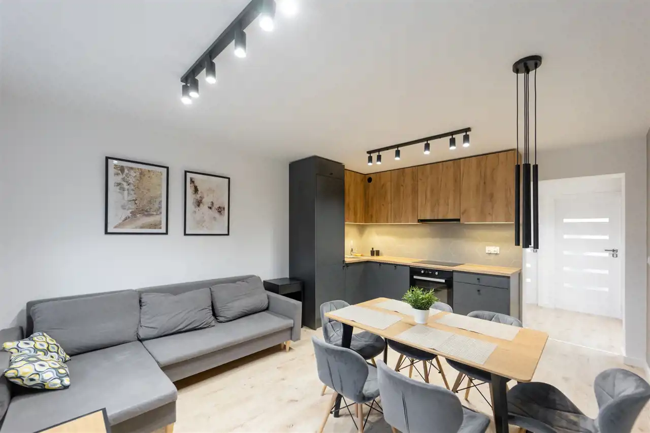 Kuchnia w pełni wyposażona, łazienka wykończona z dbałością o detale. Sprzedaż z kompletnym umeblowaniem.