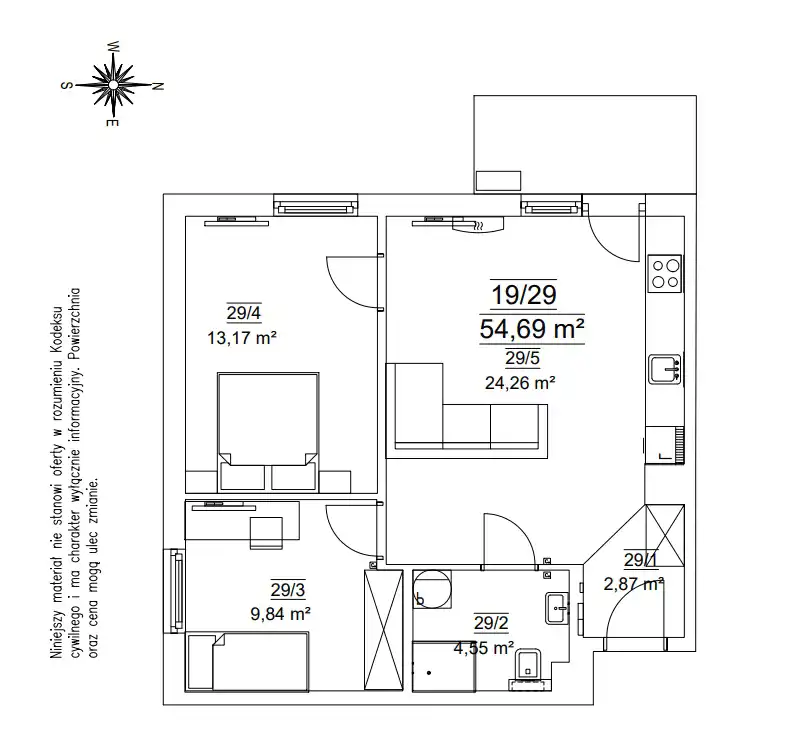 - Charakterystyka mieszkania 54.69 m2, 3 pokoje