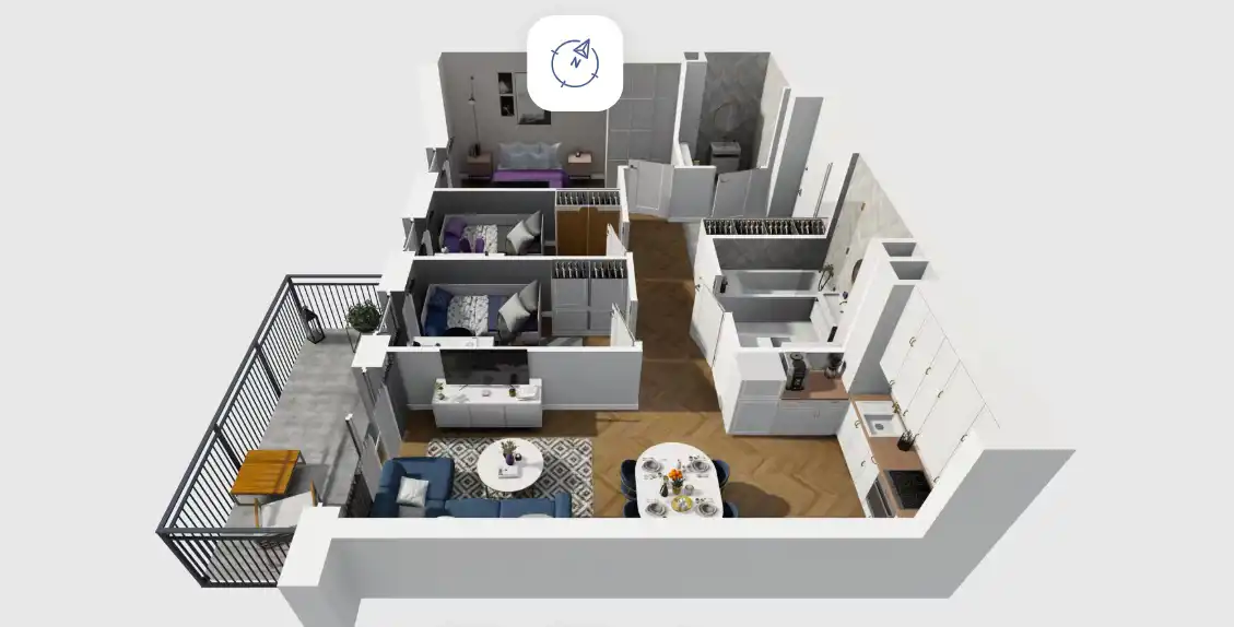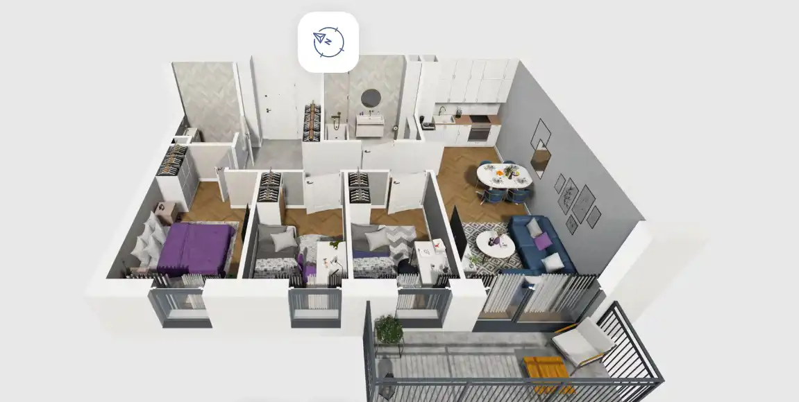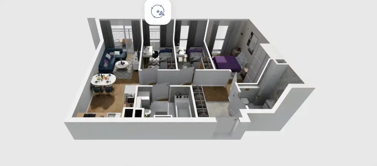 Mieszkanie składające się z salonu z aneksem kuchennym , trzech sypialni, przedpokoju, dwóch łazienek oraz balkonu.
