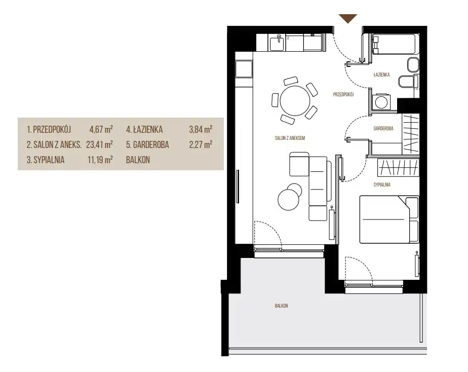 • Charakterystyka mieszkania 45.38 m2, 2 pokoje