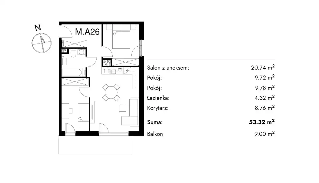 • Charakterystyka mieszkania 53.32 m2, 3 pokoje