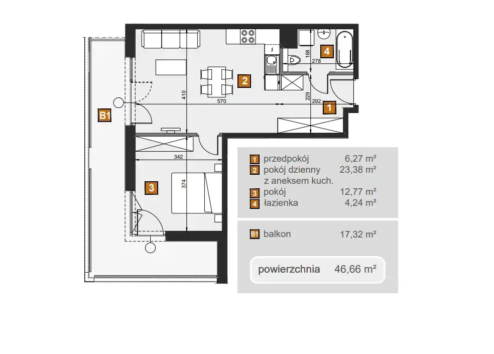 - Charakterystyka mieszkania 46.66 m2, 2 pokoje