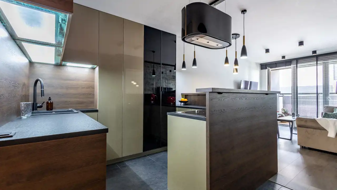 - Wyspa kuchenna z dużą, ponadstandardową płytą indukcyjną, nowoczesnym okapem, dużą lodówką w zabudowie, zmywarką oraz piekarnikiem.