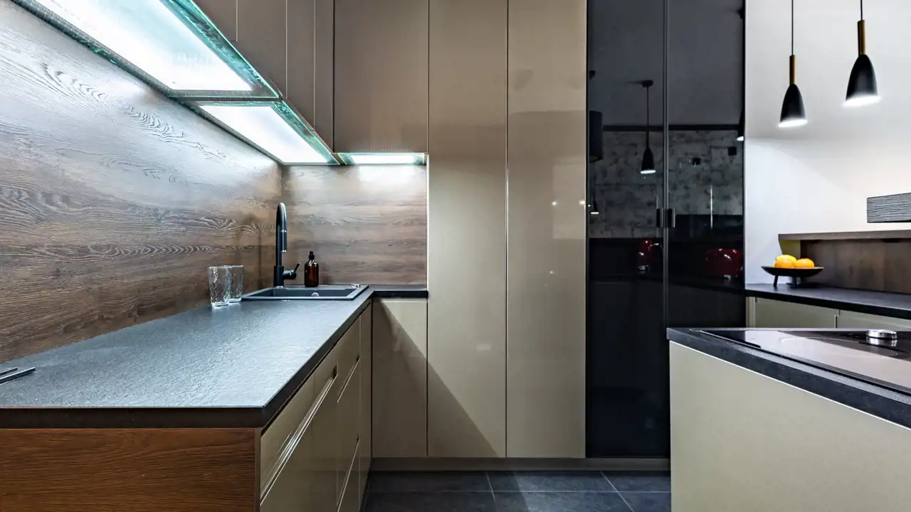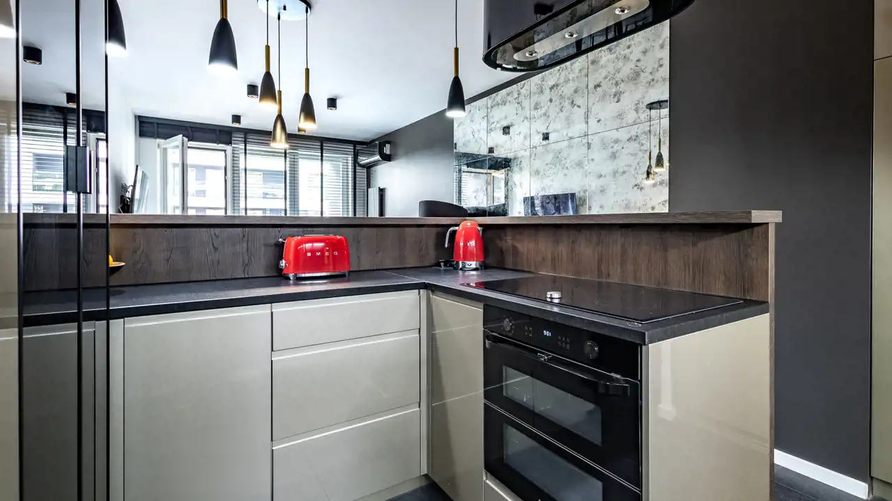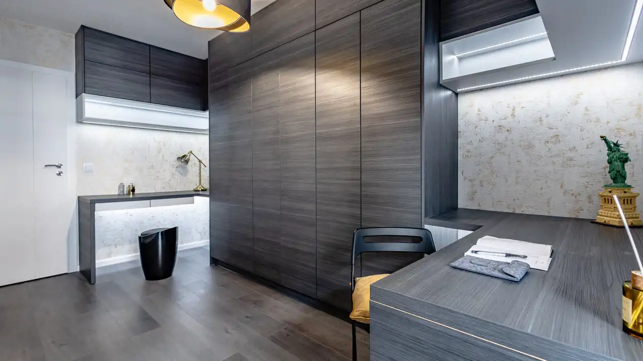 - Nowoczesna zabudowa meblowa wykonana na zamówienie, z frontami w eleganckim połysku,