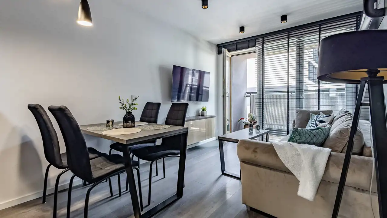 - Jadalnia z designerskimi lampami i stołem dla 4 osób,