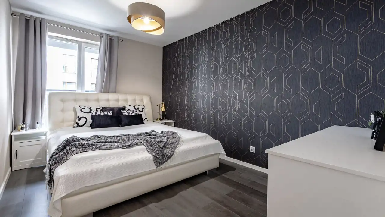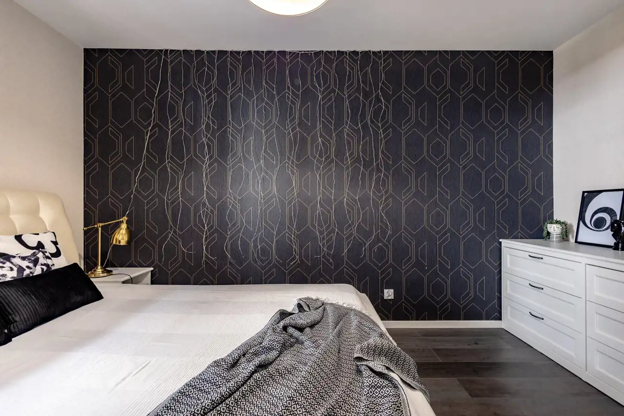 - Tapeta w geometryczny wzór na jednej ze ścian,