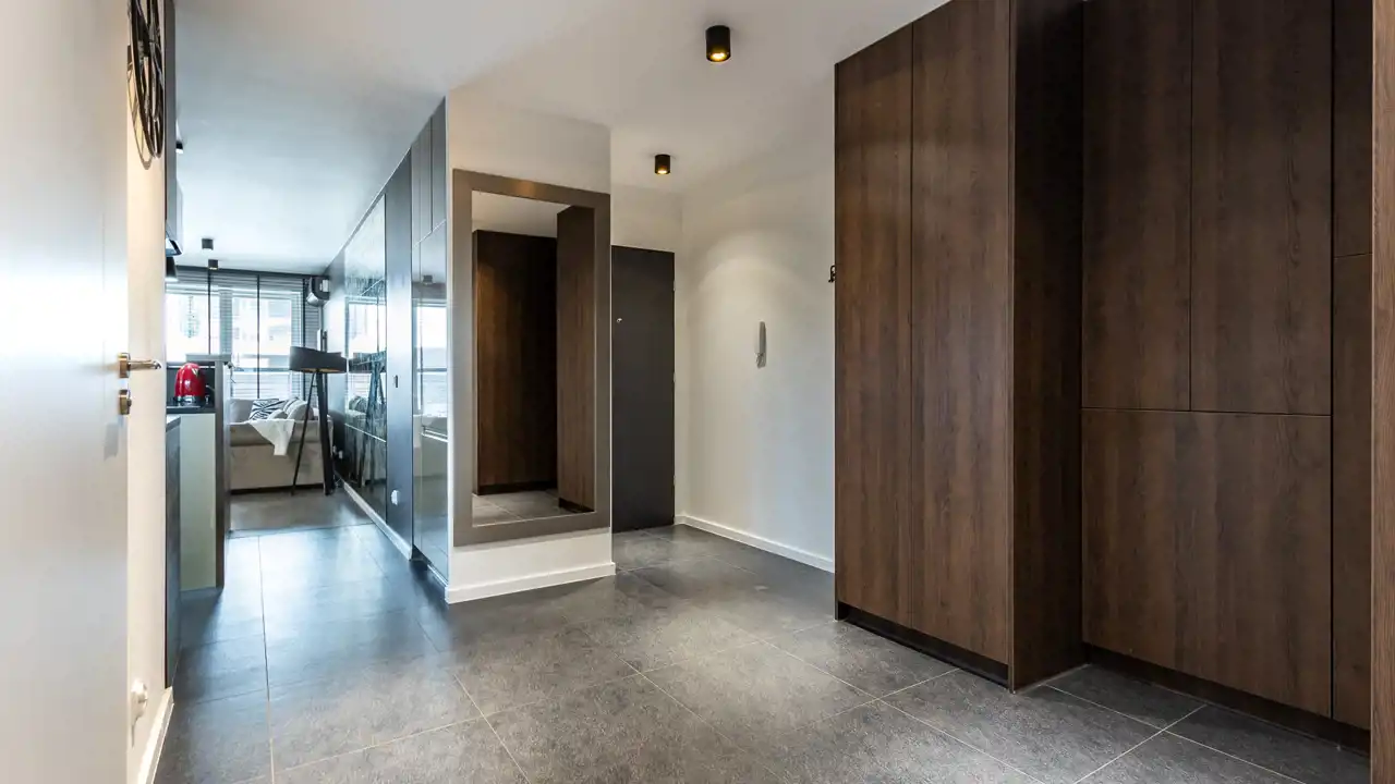 - Ściana z dekoracyjnymi lustrami optycznie powiększającymi przestrzeń.