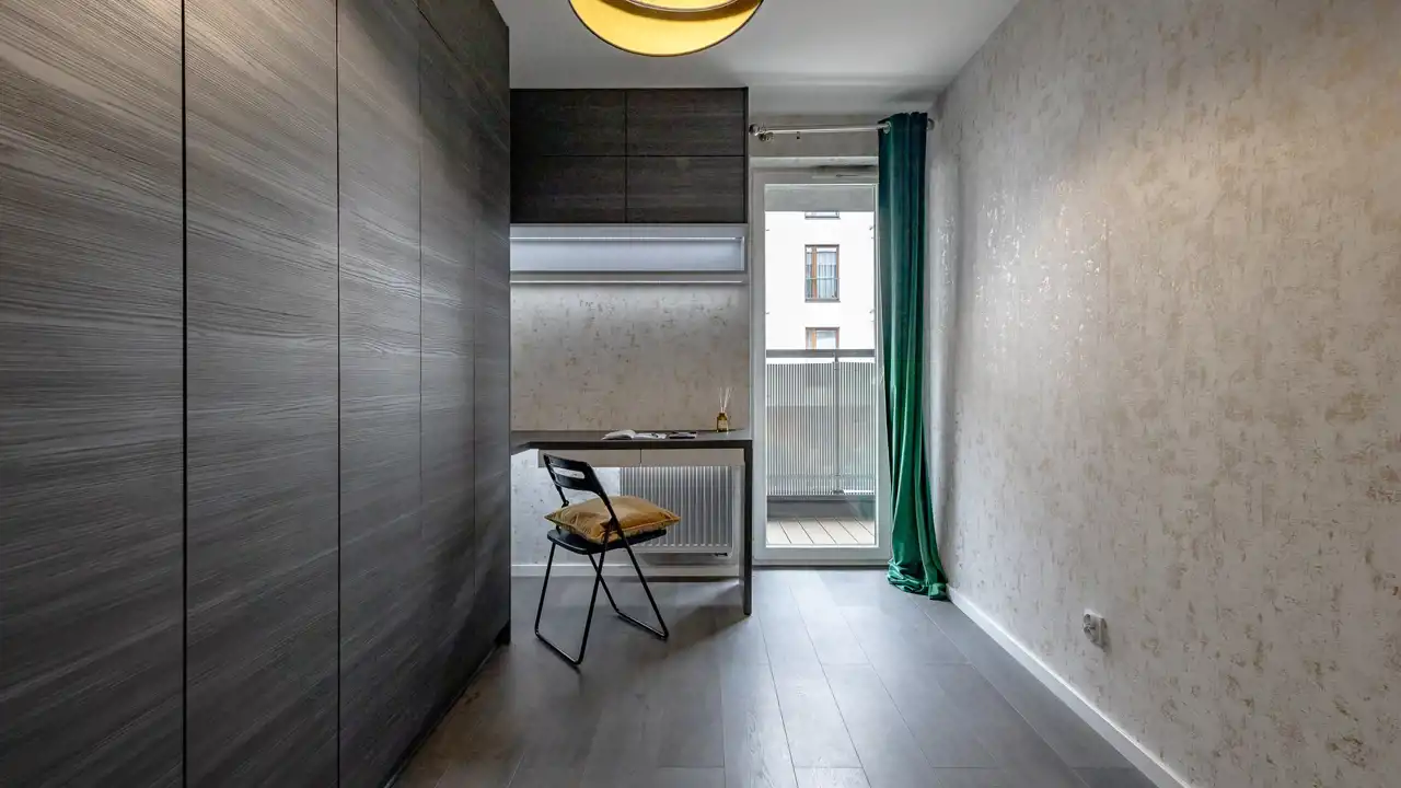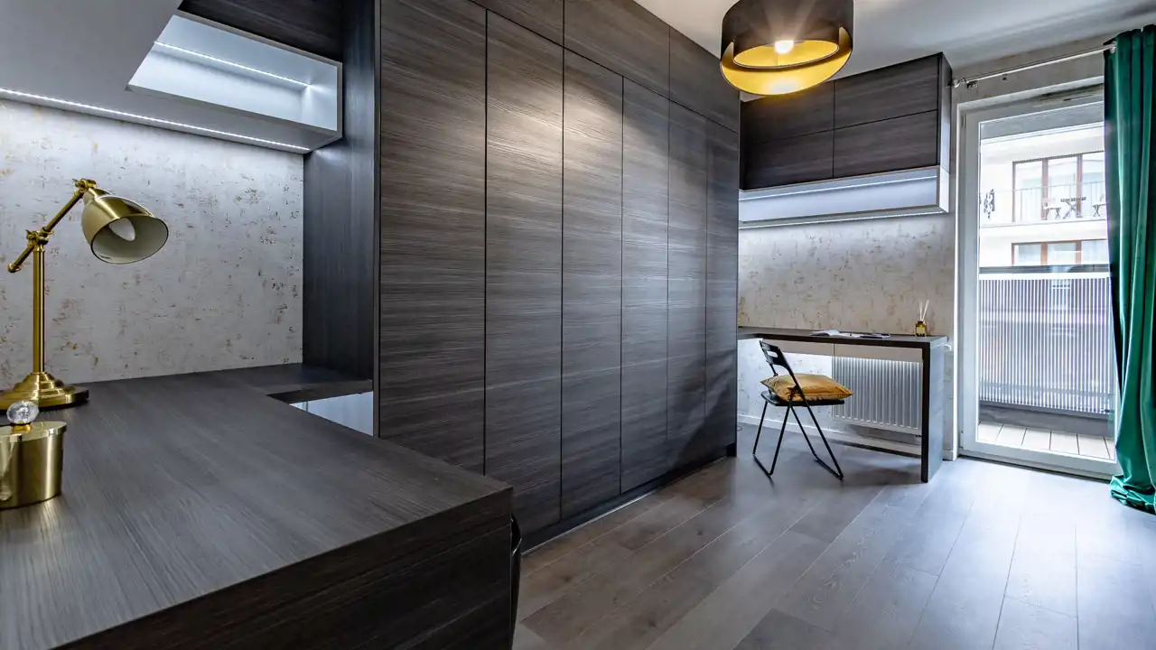 - Zabudowa na wymiar, miejsce do pracy, biurko przy oknie, regały i szafy.