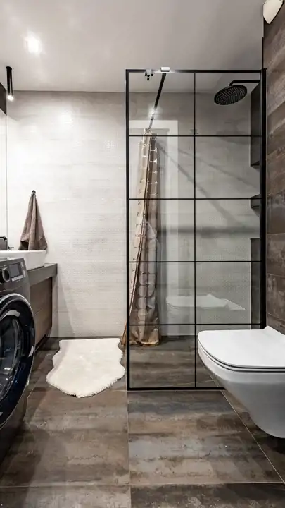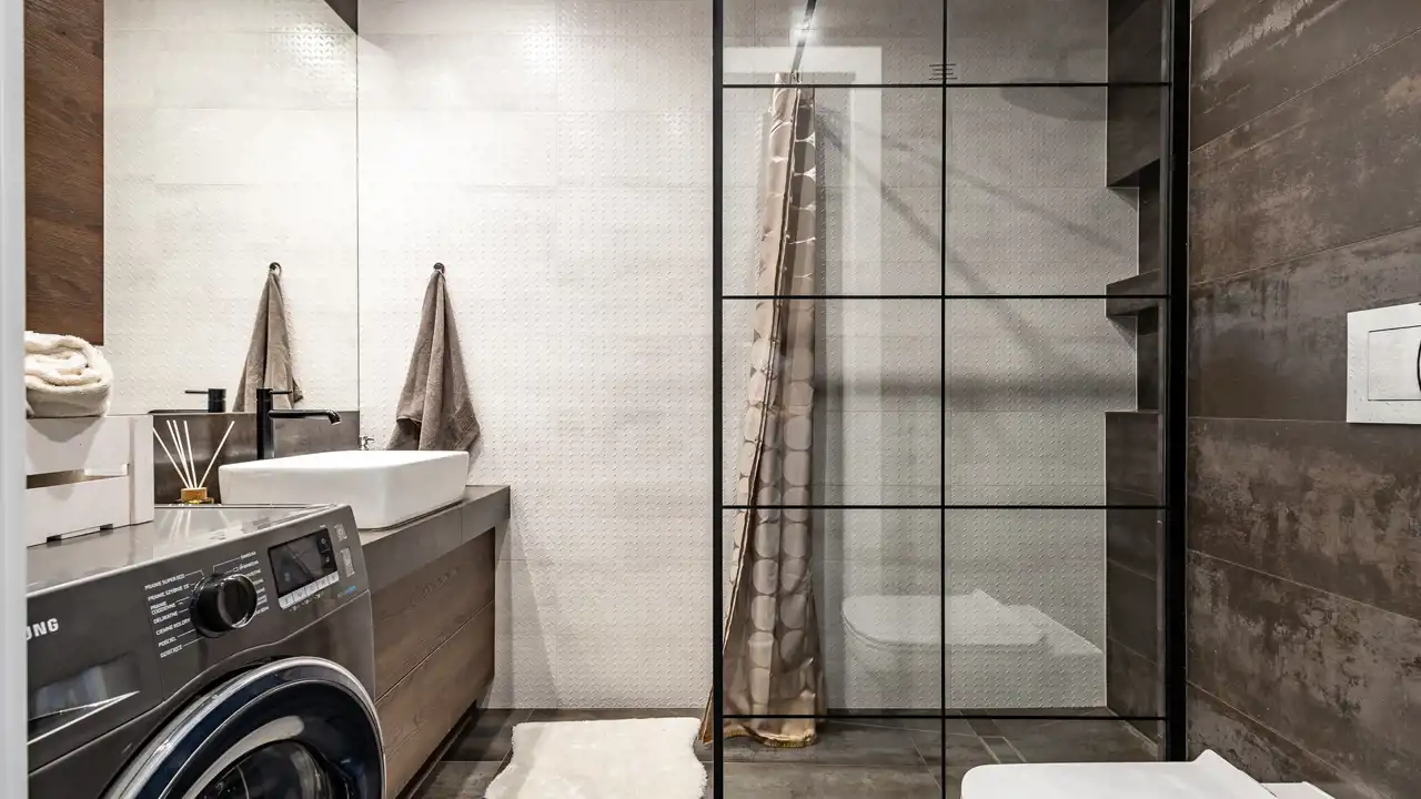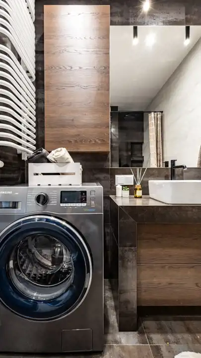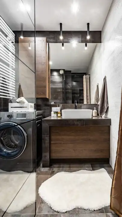- Pralka w zabudowie, umywalka nablatowa i nowoczesna armatura.