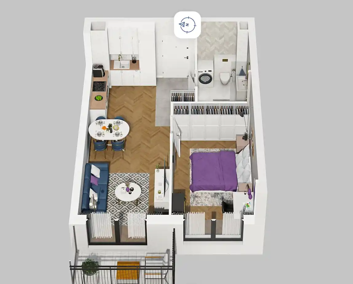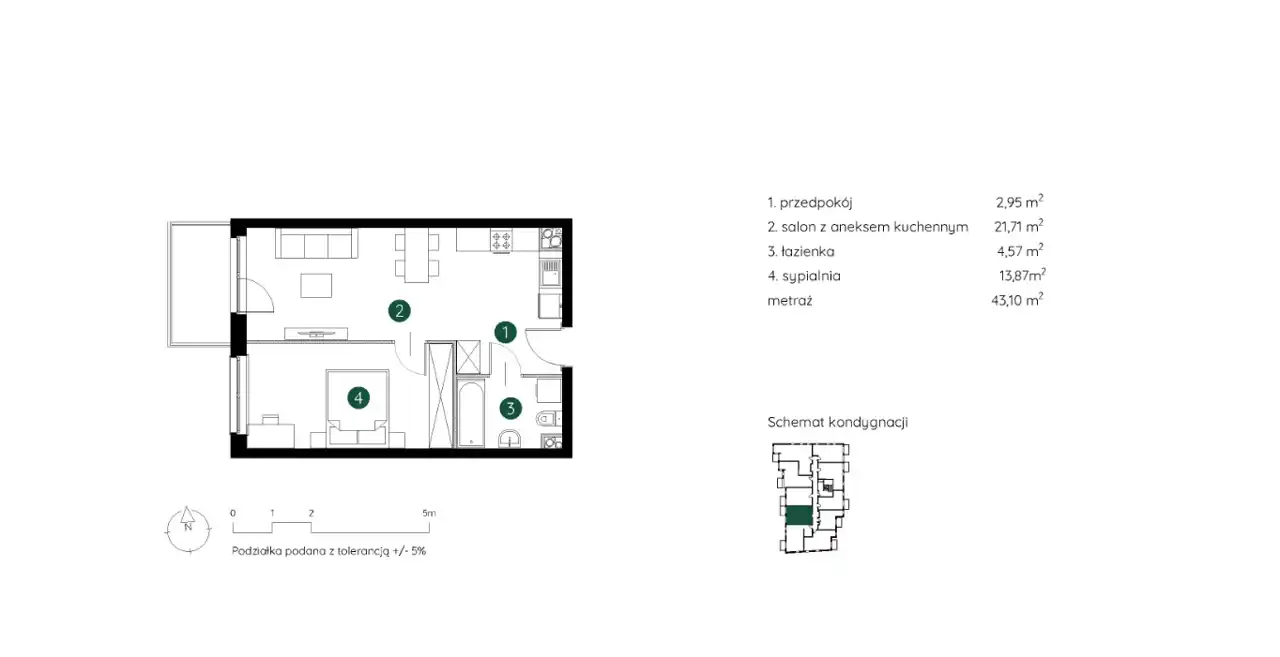 - Charakterystyka mieszkania 43.24 m2, 2 pokoje