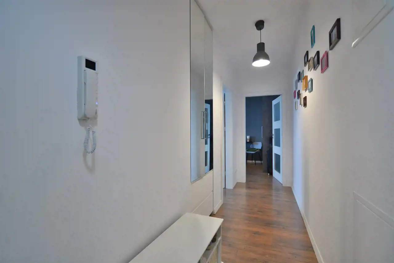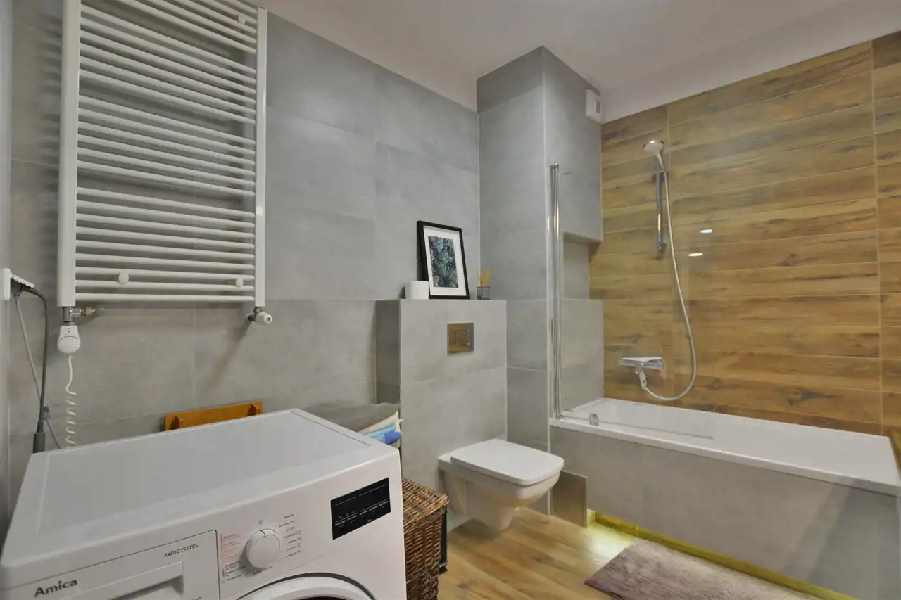 W pokojach i przedpokoju na podłogach panele, w części kuchennej płytki; kuchnia zabudowana na wymiar, wyposażona w sprzęt AGD, tj. lodówko-zamrażarka, piekarnik, płyta indukcyjna, pochłaniacz, zmywarka. Okna PCV (moskitiery), bardzo przestronna łazienka z WC i wanną z funkcją prysznica, wyposażona w pralko-suszarkę. W salonie zamontowana klimatyzacja.