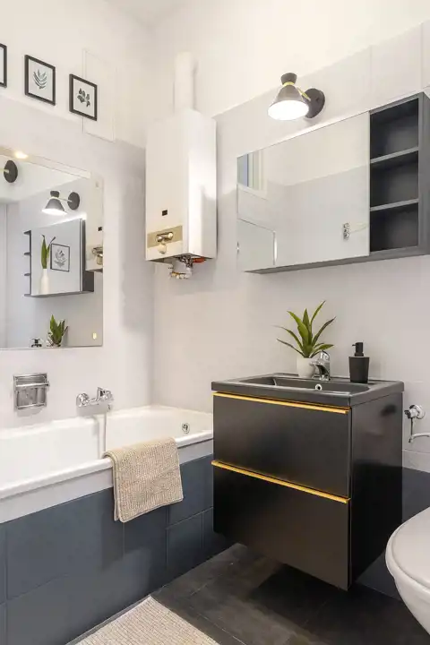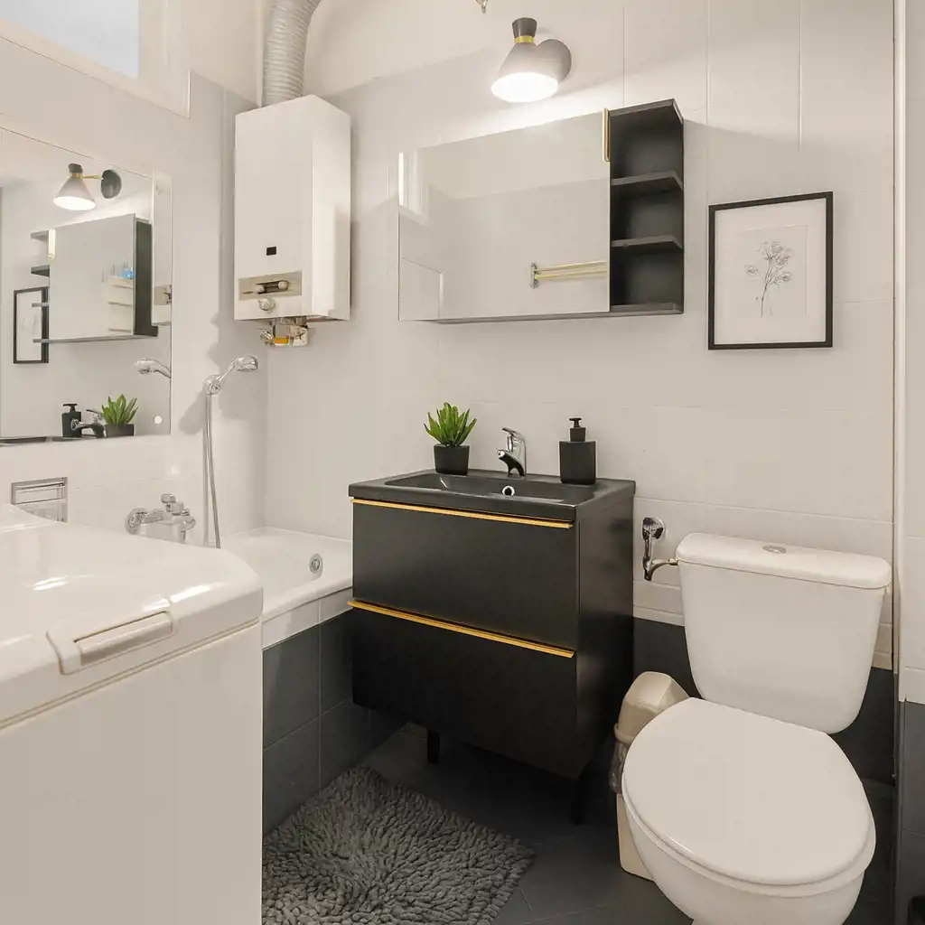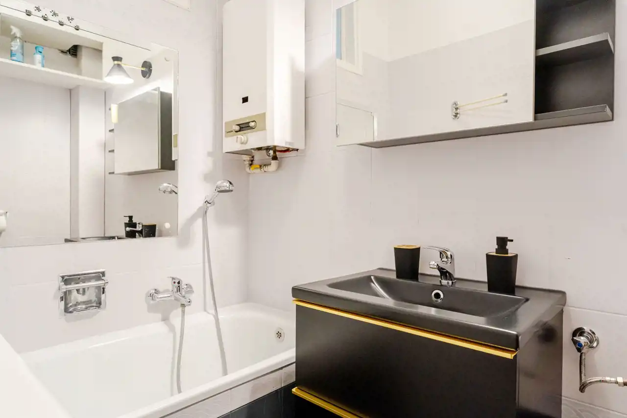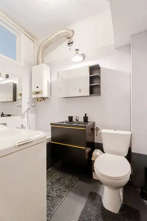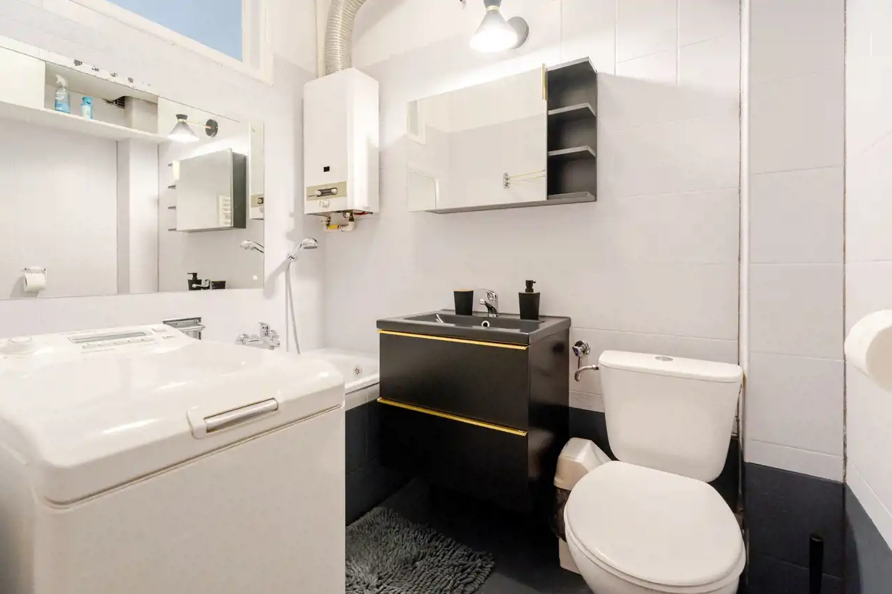 -Łazienki (ok. 3,5 m²) z wanną, WC, pralką i oknem do kuchni (możliwość wentylacji naturalnej).