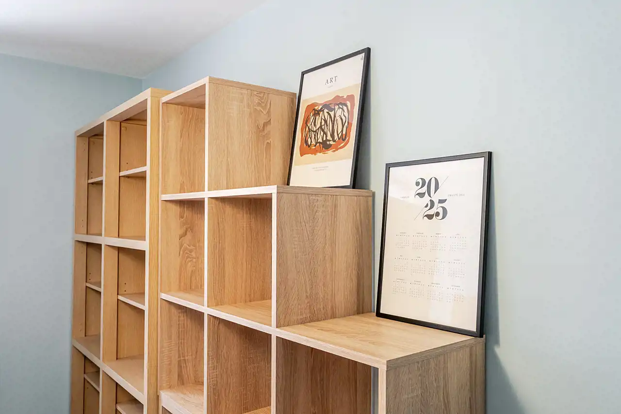 Idealny home office – wyposażony w biurko i regały.