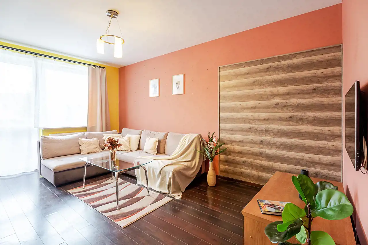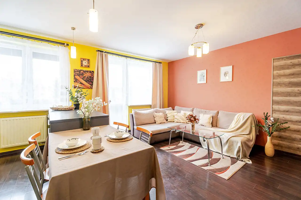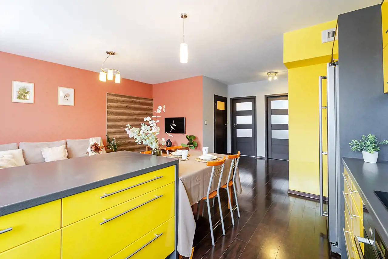 Jasna, otwarta przestrzeń z wyjściem na balkon. Kuchnia w pełni wyposażona: płyta indukcyjna, piekarnik, duża dwudrzwiowa lodówka, szeroka lada-wyspa oraz stół z czterema krzesłami. Część wypoczynkowa z dużą, wygodną sofą, ławą, telewizorem zamontowanym na ścianie oraz szafką RTV.