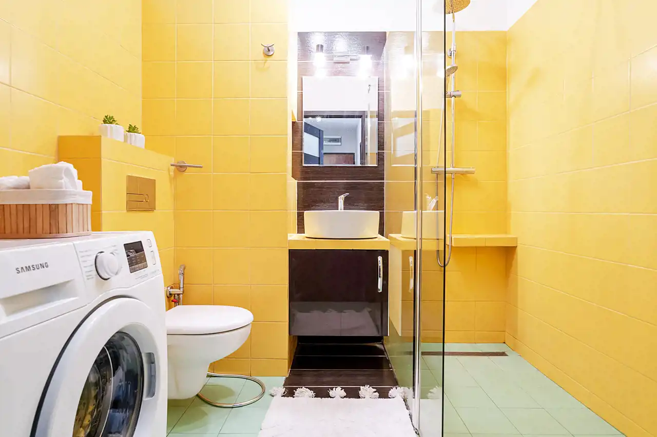 Z kabiną prysznicową, pralką, bidetówką oraz praktycznymi szafkami.