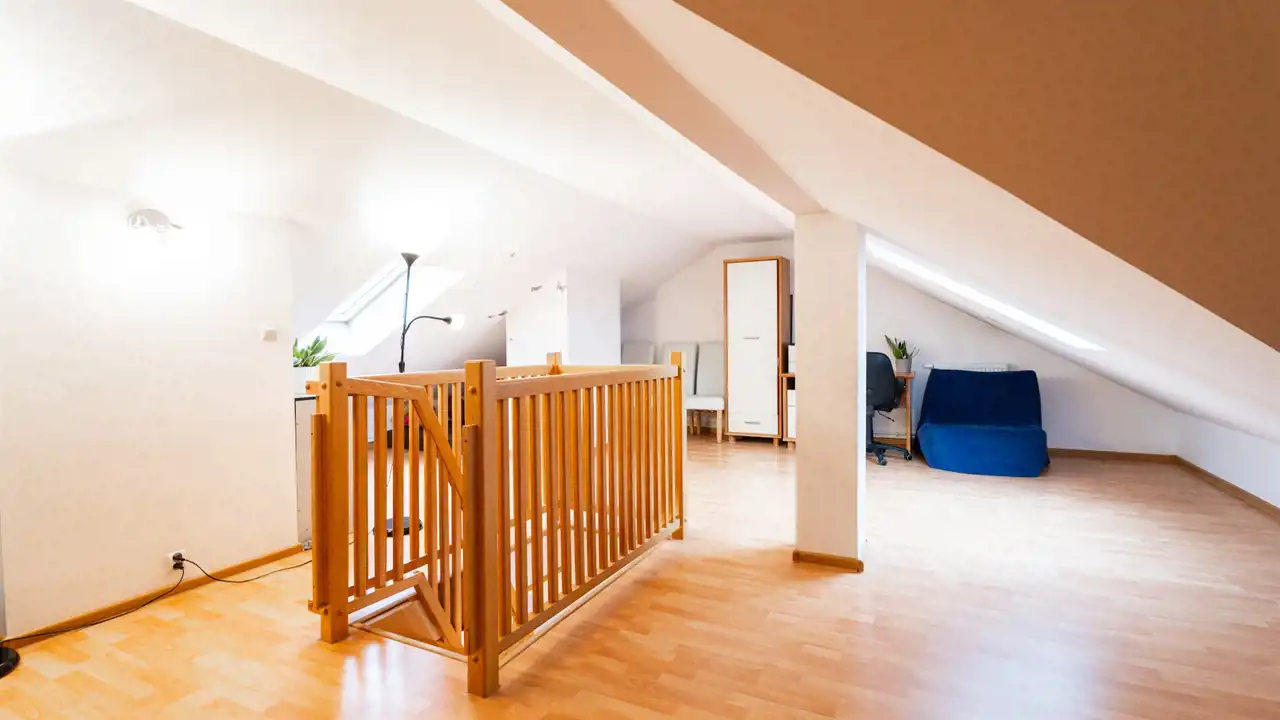 POZIOM 2: (ok.11,28 m2 użytkowych, zdecydowanie więcej po podłodze) poddasze jest prawie nad całością parteru. Obecnie otwarta przestrzeń typu open spece do własnej adaptacji na jeden, dwa pokoje, lub do własnej adaptacji wg pomysłu przyszłego nabywcy.